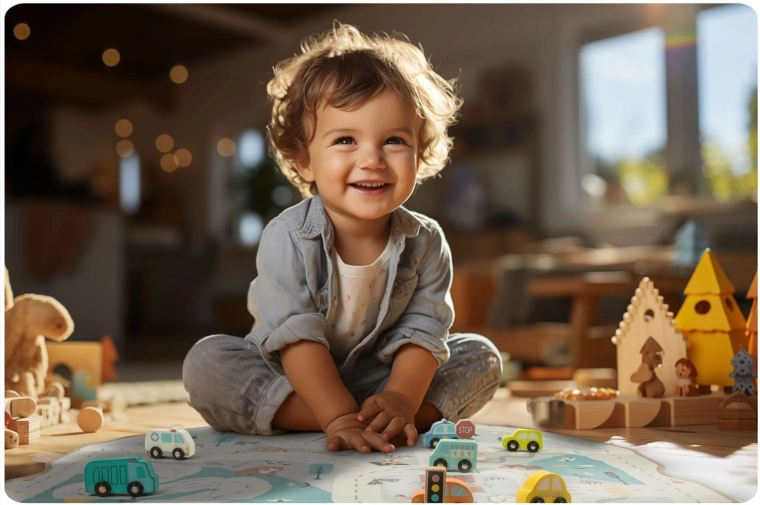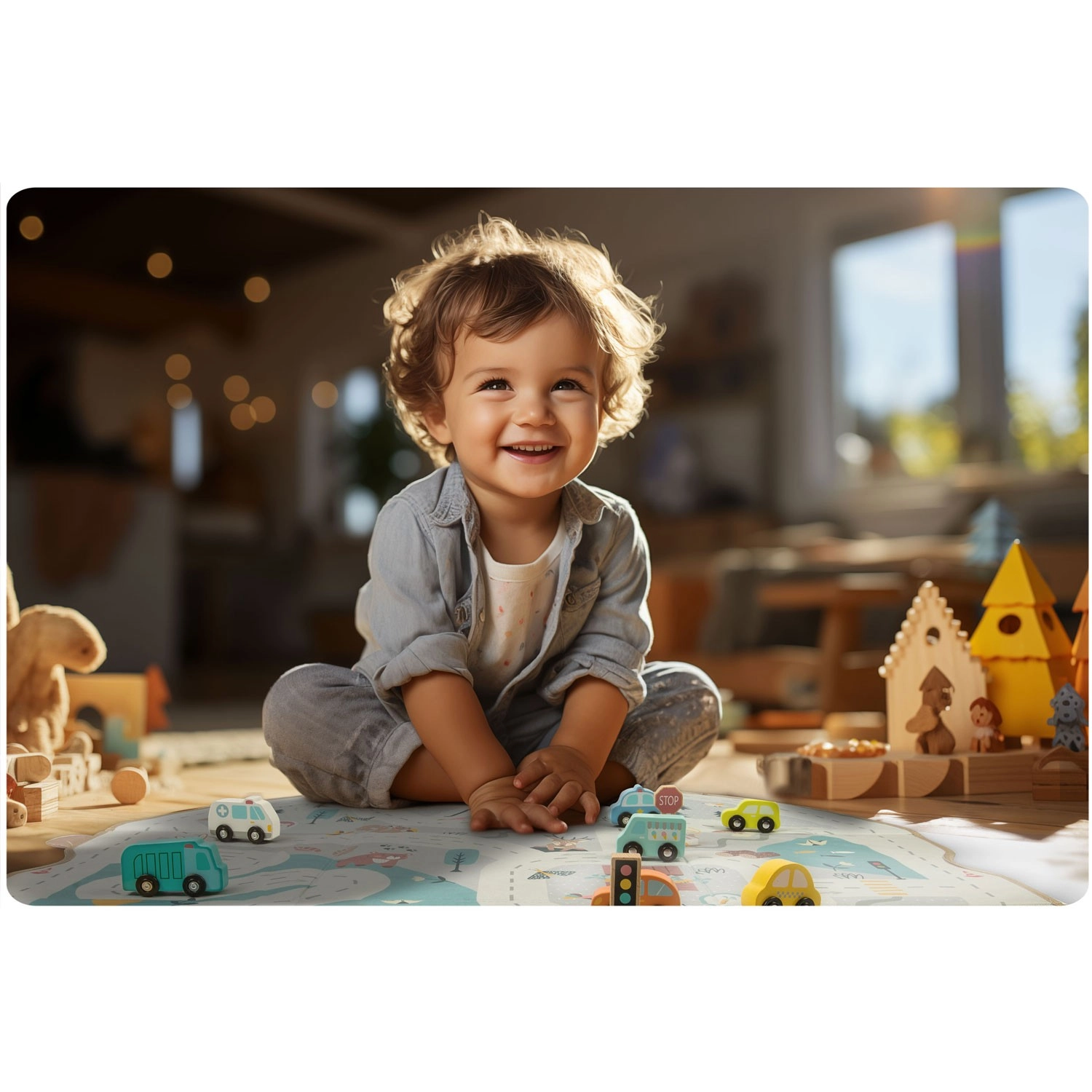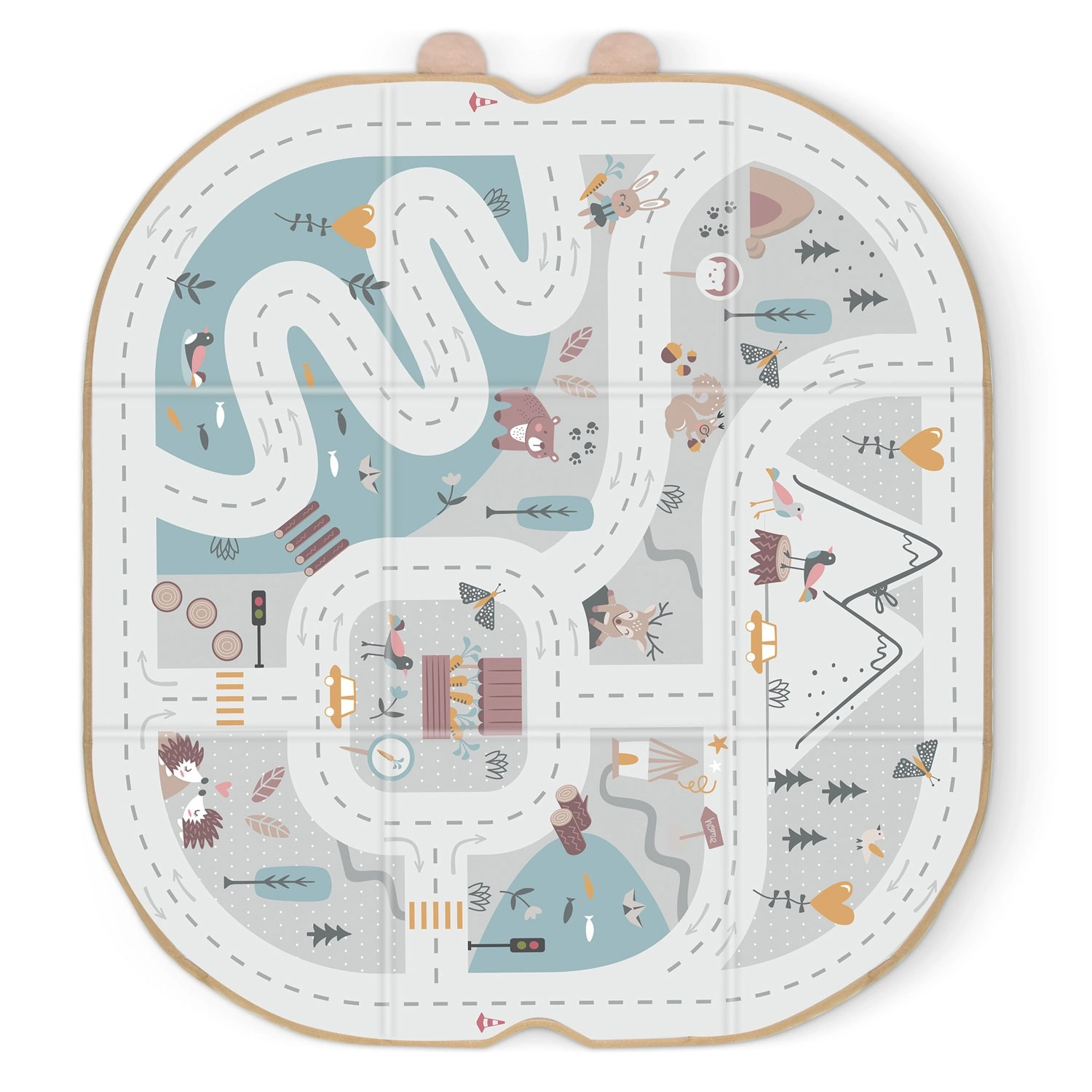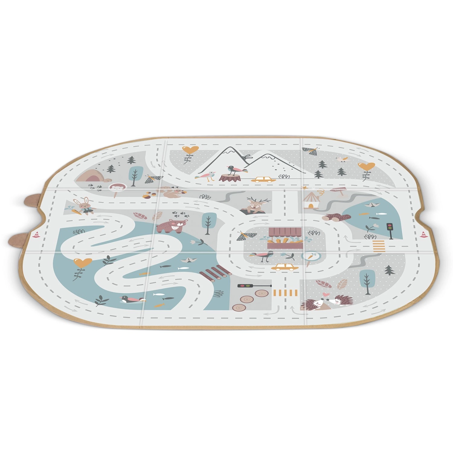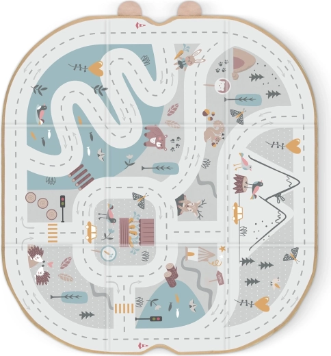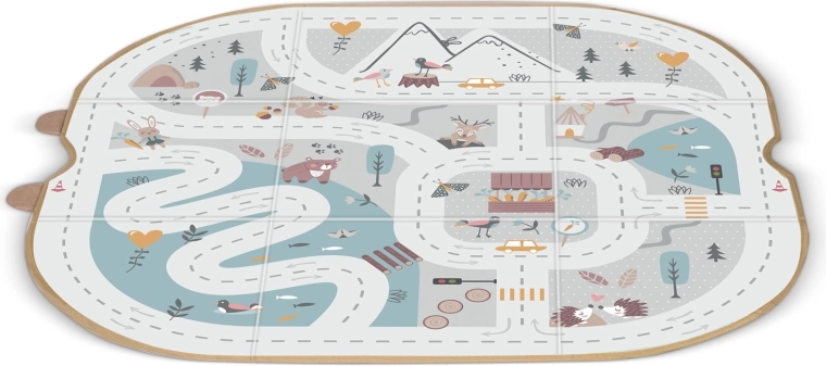 Weiche Paneele mit Aufdruck von Straßen, Bergen und Tieren fördern das kreative Spiel mit Autos und Figuren und bieten eine angenehme Oberfläche.
