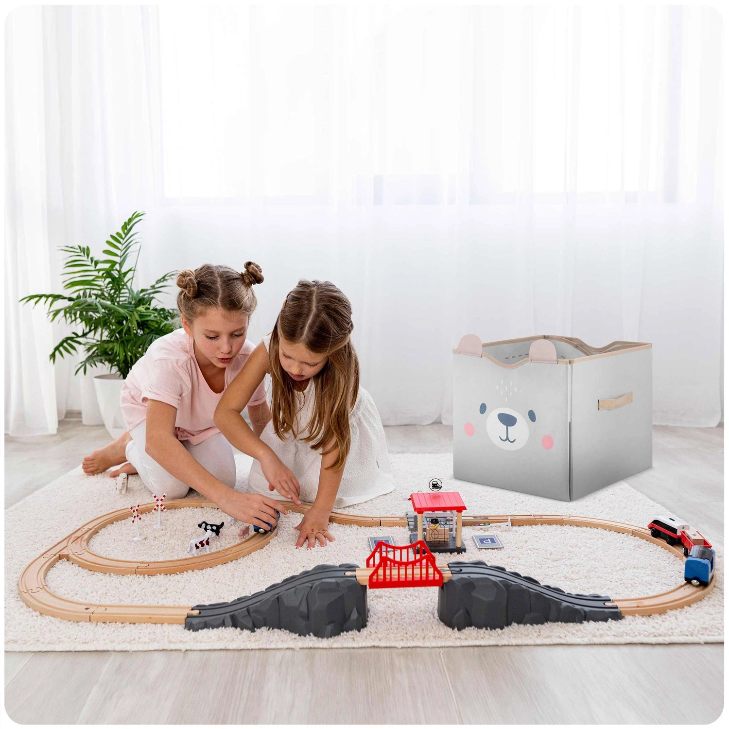 Verwandeln Sie den geräumigen Spielzeugkorb mit einem Handgriff in eine Spielmatte mit Straßen. Die Kinder spielen, Sie sparen Platz und Zeit.