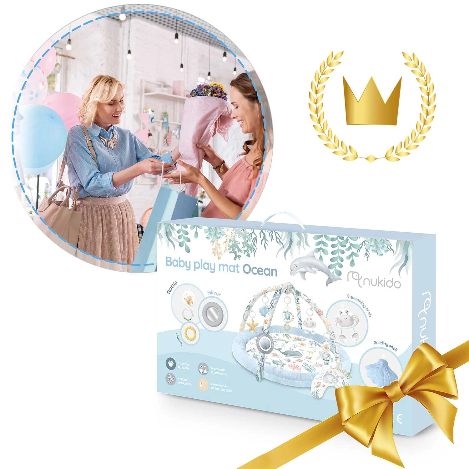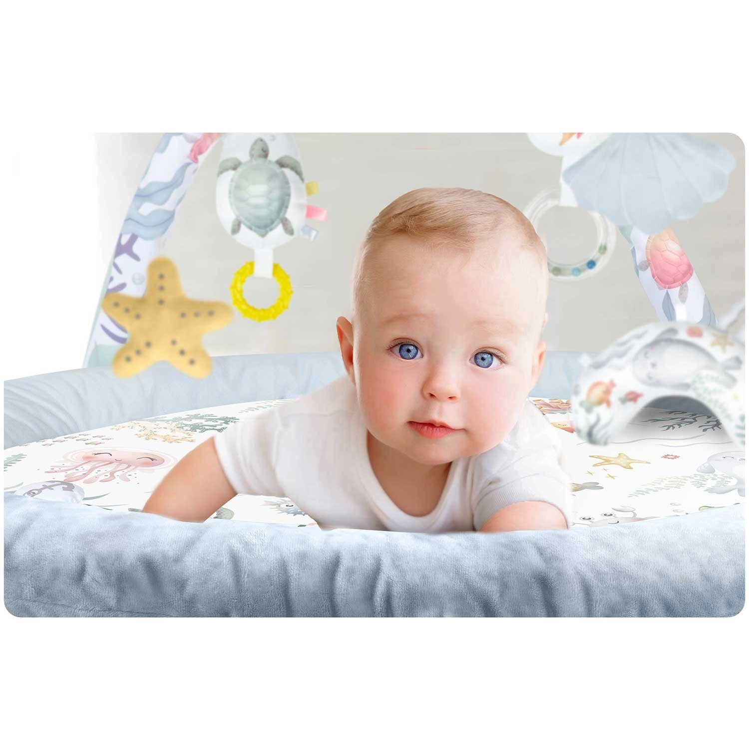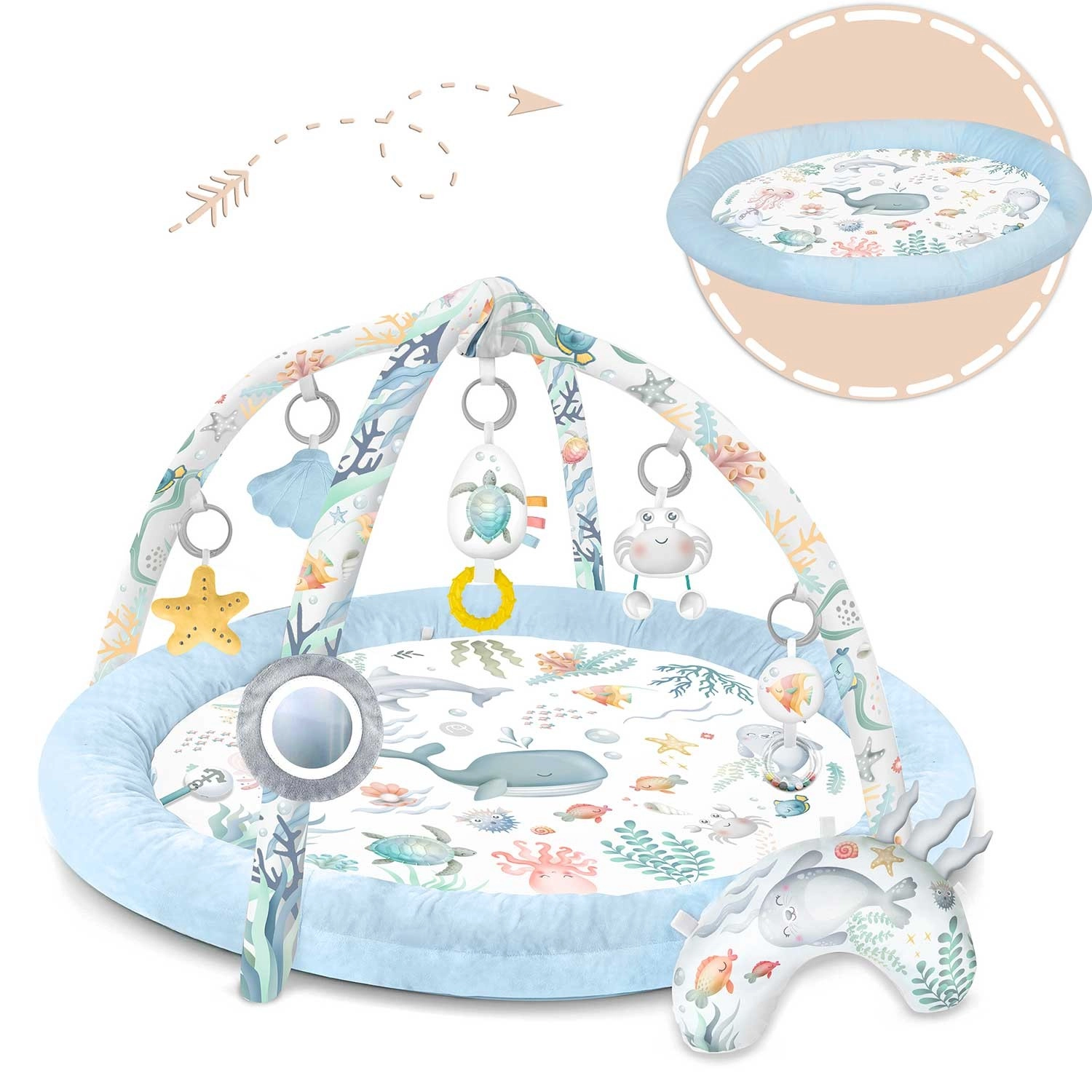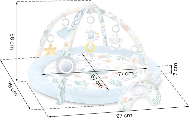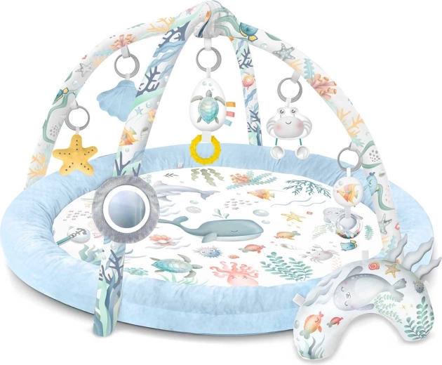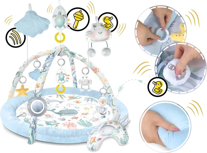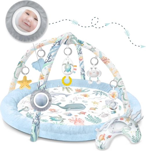 Die Spieldecke Nukido Ocean schafft eine gemütliche und sichere Umgebung für Neugeborene und größere Babys. Zwei sich kreuzende Bögen tragen abnehmbare Spielzeuge, die Sehen, Tasten und Hören fördern – vom Spiegel zur Selbsterkennung über Rasseln bis hin zu raschelnden Elementen und einer quietschenden Krabbe. Ebenfalls enthalten ist ein weiches Kissen für bequemes Spielen in Bauchlage.