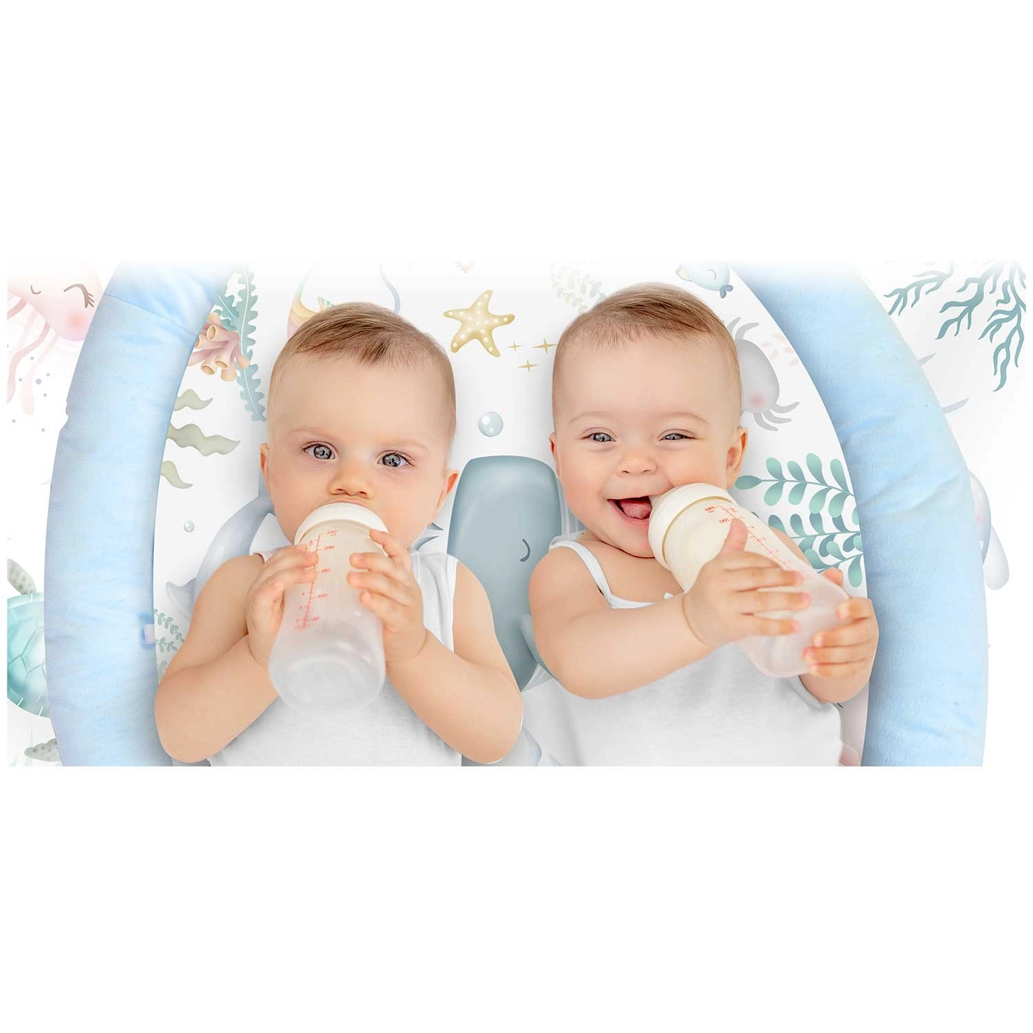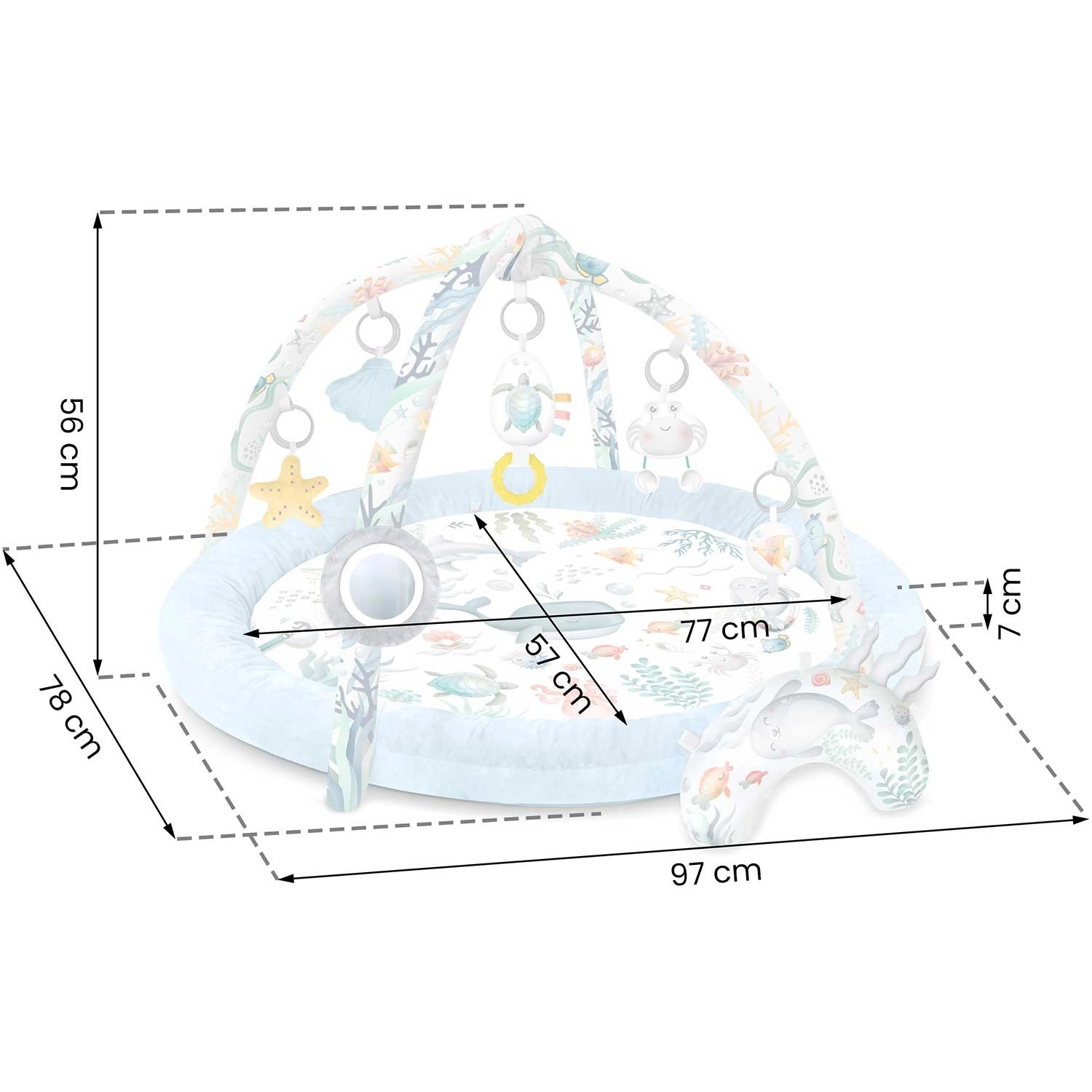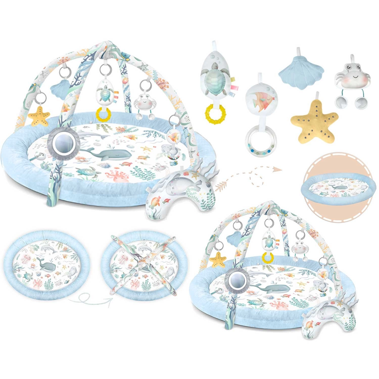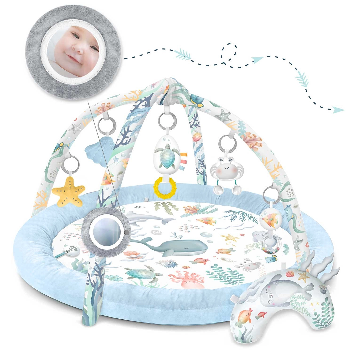 Die Spieldecke Nukido Ocean schafft eine gemütliche und sichere Umgebung für Neugeborene und größere Babys. Zwei sich kreuzende Bögen tragen abnehmbare Spielzeuge, die Sehen, Tasten und Hören fördern – vom Spiegel zur Selbsterkennung über Rasseln bis hin zu raschelnden Elementen und einer quietschenden Krabbe. Ebenfalls enthalten ist ein weiches Kissen für bequemes Spielen in Bauchlage.