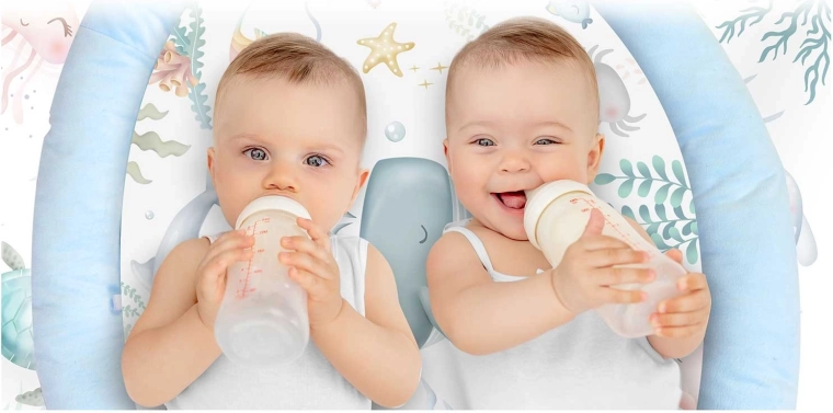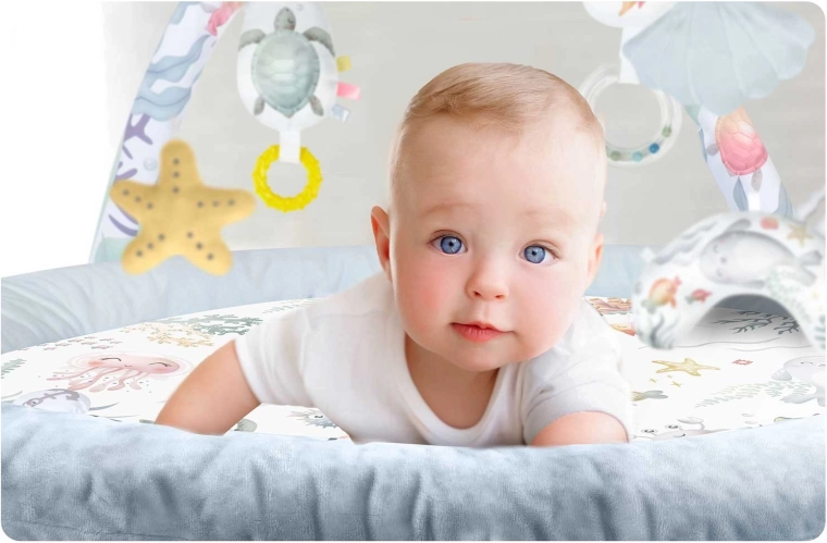 • Motorikförderung: hängende Spielzeuge zum Üben von Greifen und Hand-Auge-Koordination, Kissen für eine gesunde Bauchlage.