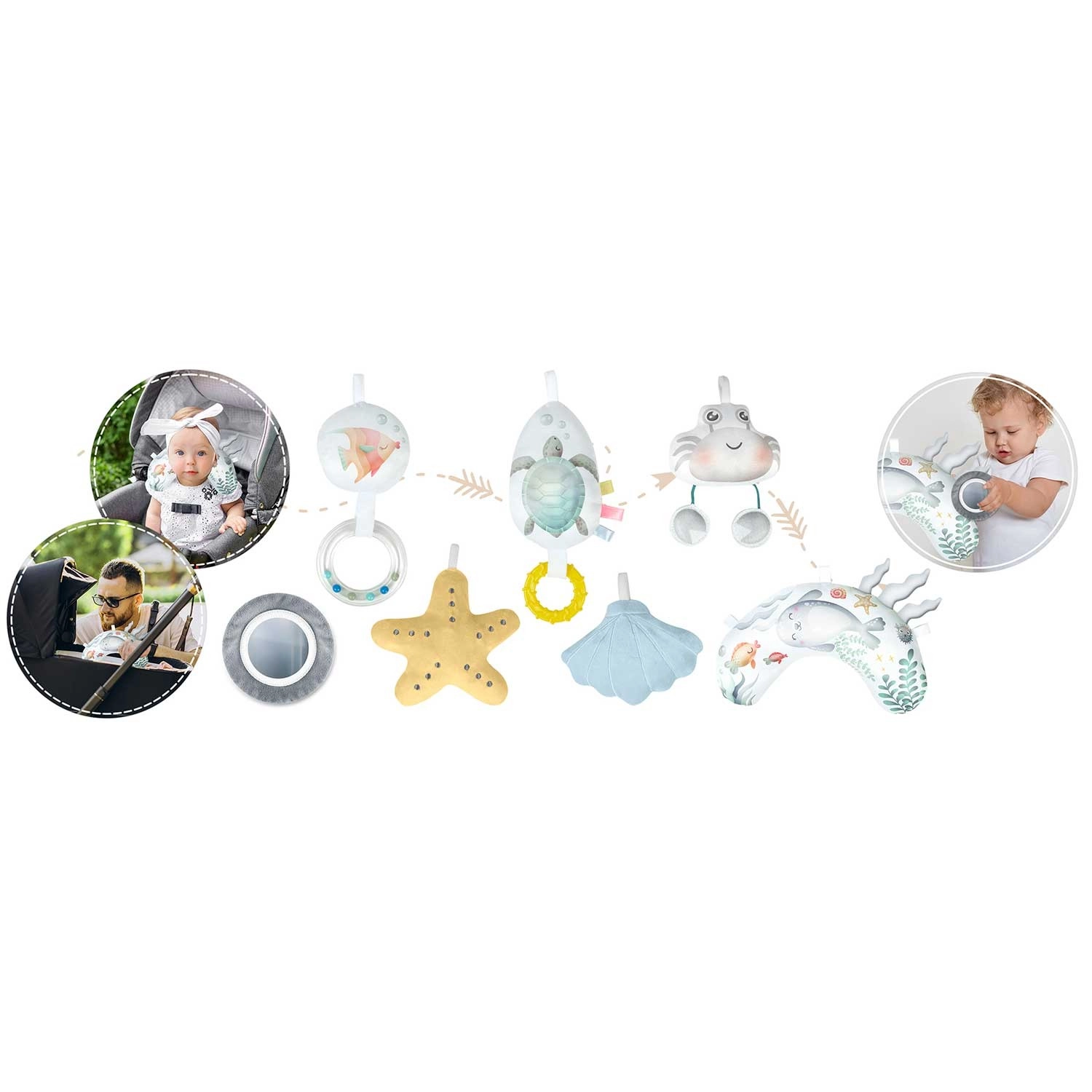 Spiegel, Rasseln, Raschelelemente, Quietschspielzeug (Krabbe), weiche Hängefiguren