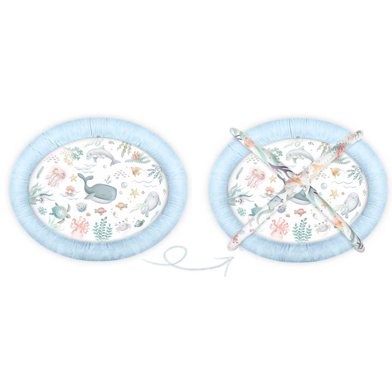 Die Bögen lassen sich schnell abnehmen und die Decke zusammenfalten. So entsteht ein gemütlicher Kokon für Neugeborene oder eine großzügige Unterlage für Kleinkinder – stets mit weicher, leicht zu reinigender Oberfläche.