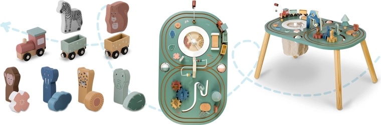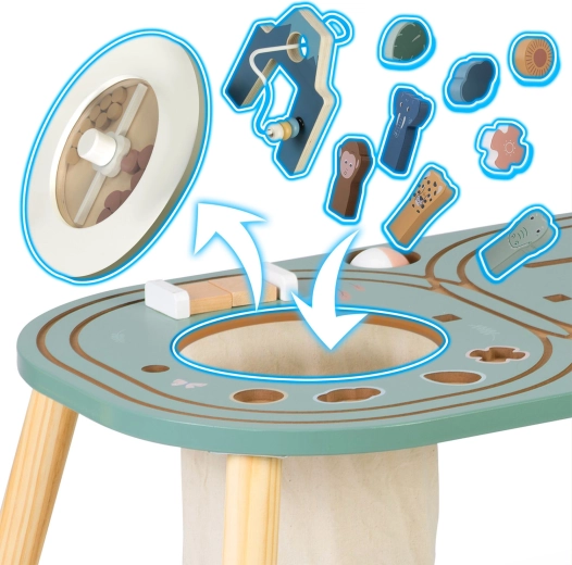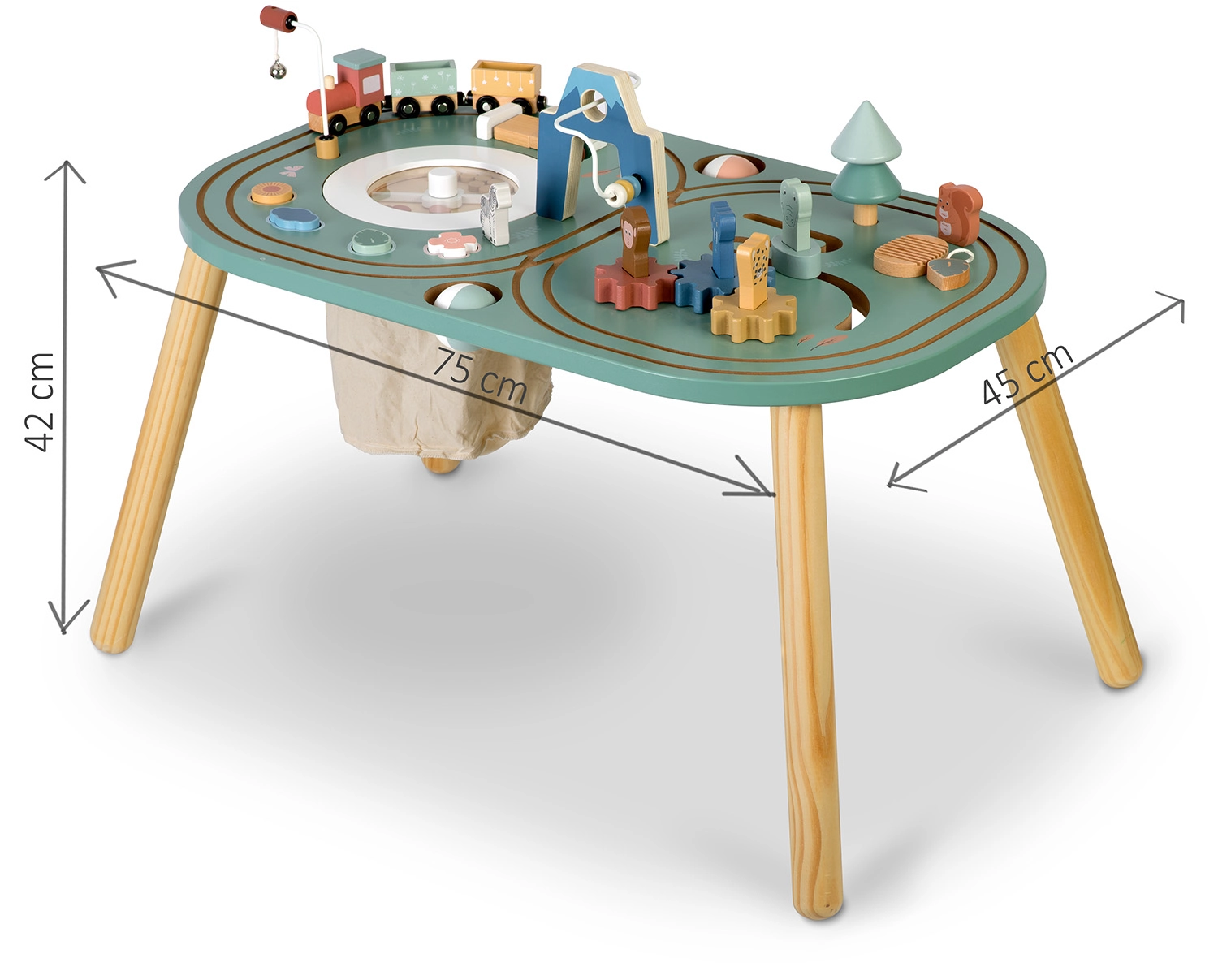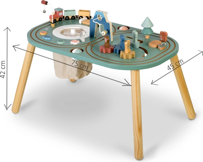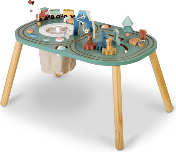 Der Tisch ist aus Naturholz mit glatten, abgerundeten Kanten gefertigt und mit sicheren, unbedenklichen Farben oberflächenveredelt. Das minimalistische Design in gedeckten Farben passt in moderne Interieurs und dank der stabilen Konstruktion hält er täglichem Spiel stand. Der praktische gewebte Beutel unter der Platte hilft, Ordnung zu halten – nach dem Spielen einfach alles verstauen.