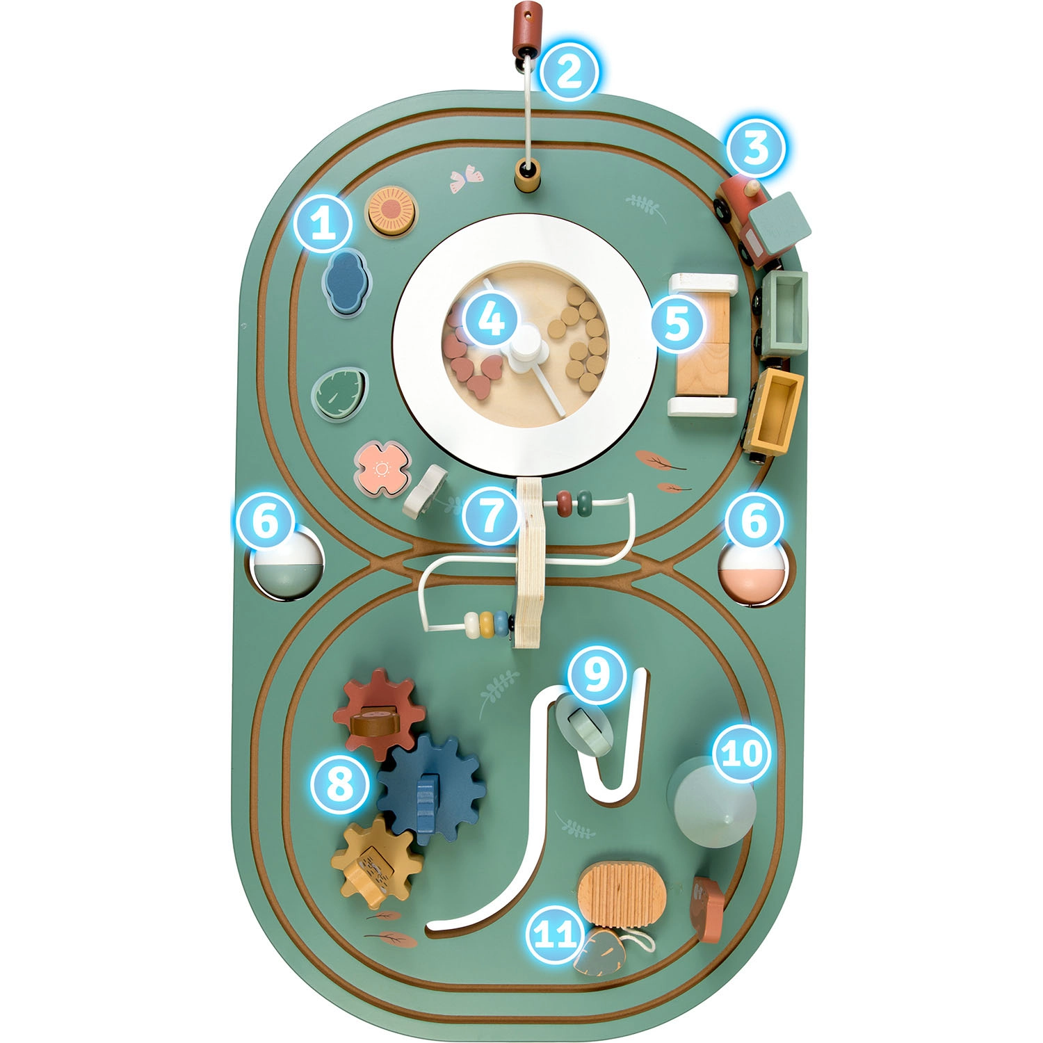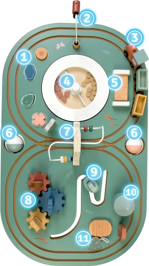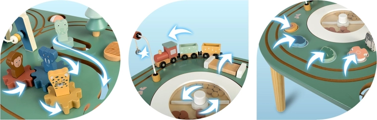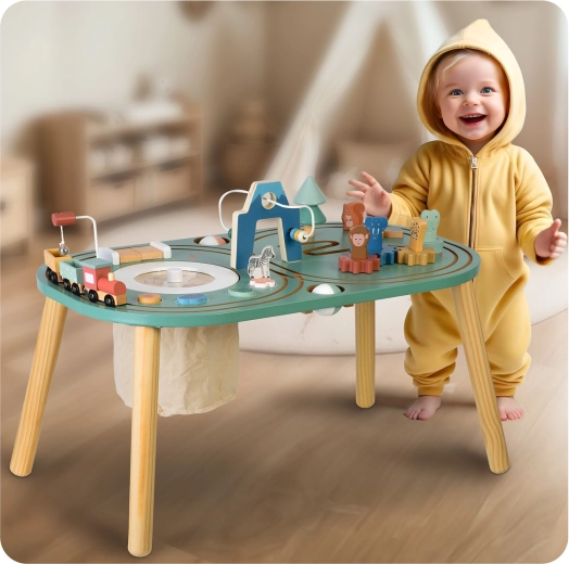 Der sensorische Kindertisch NUKIDO vereint Spiel und Lernen in einem. Auf der großzügigen Spielfläche finden Kinder eine magnetische Eisenbahn mit Lok und Waggons, eine Kugelbahn, ein rotierendes Mühlrad, Zahnräder, ein Perlenlabyrinth, Formensortierung und weitere schlaue Aktivitäten. Jedes Element fördert Hand-Auge-Koordination, logisches Denken, Bewegungsplanung und Geduld.
