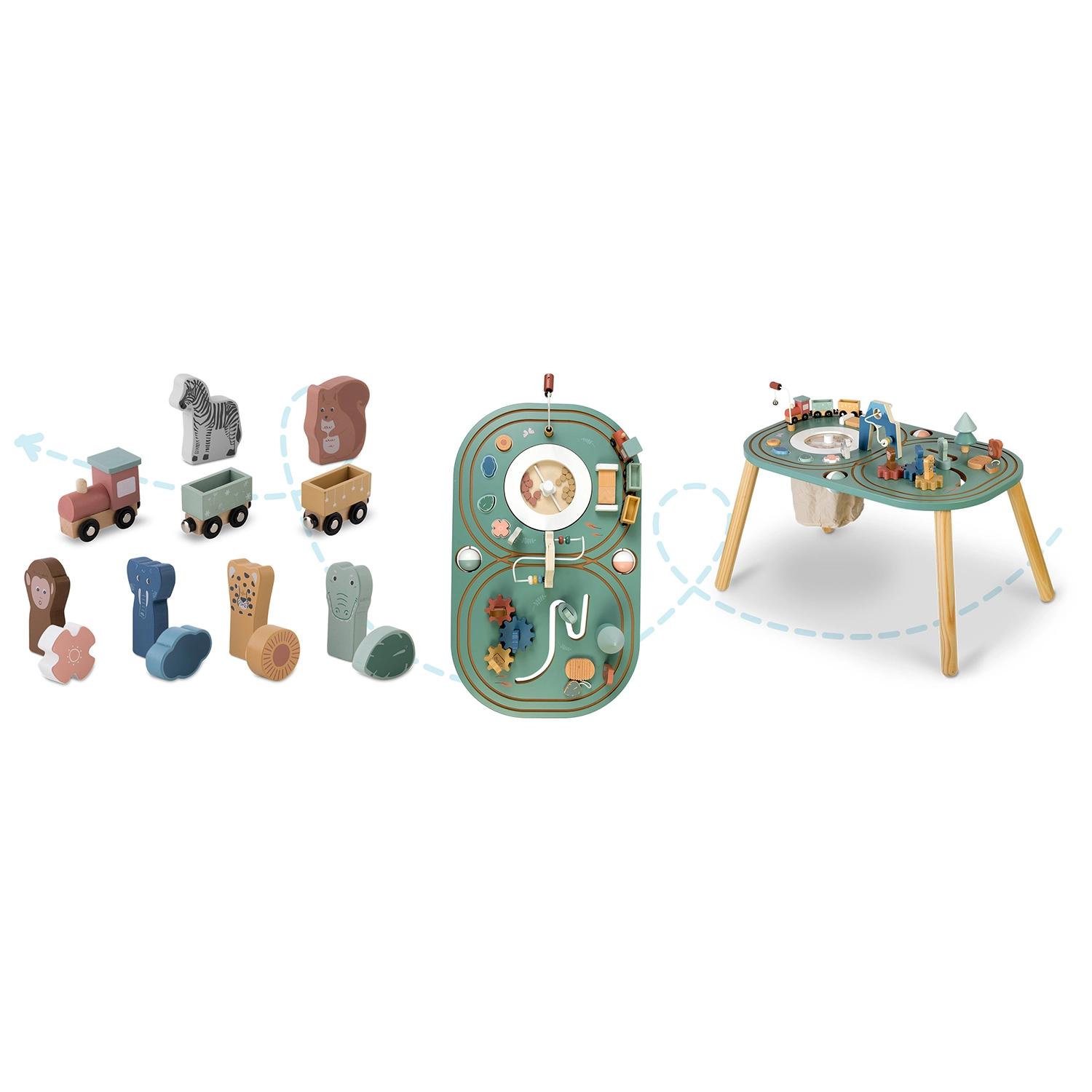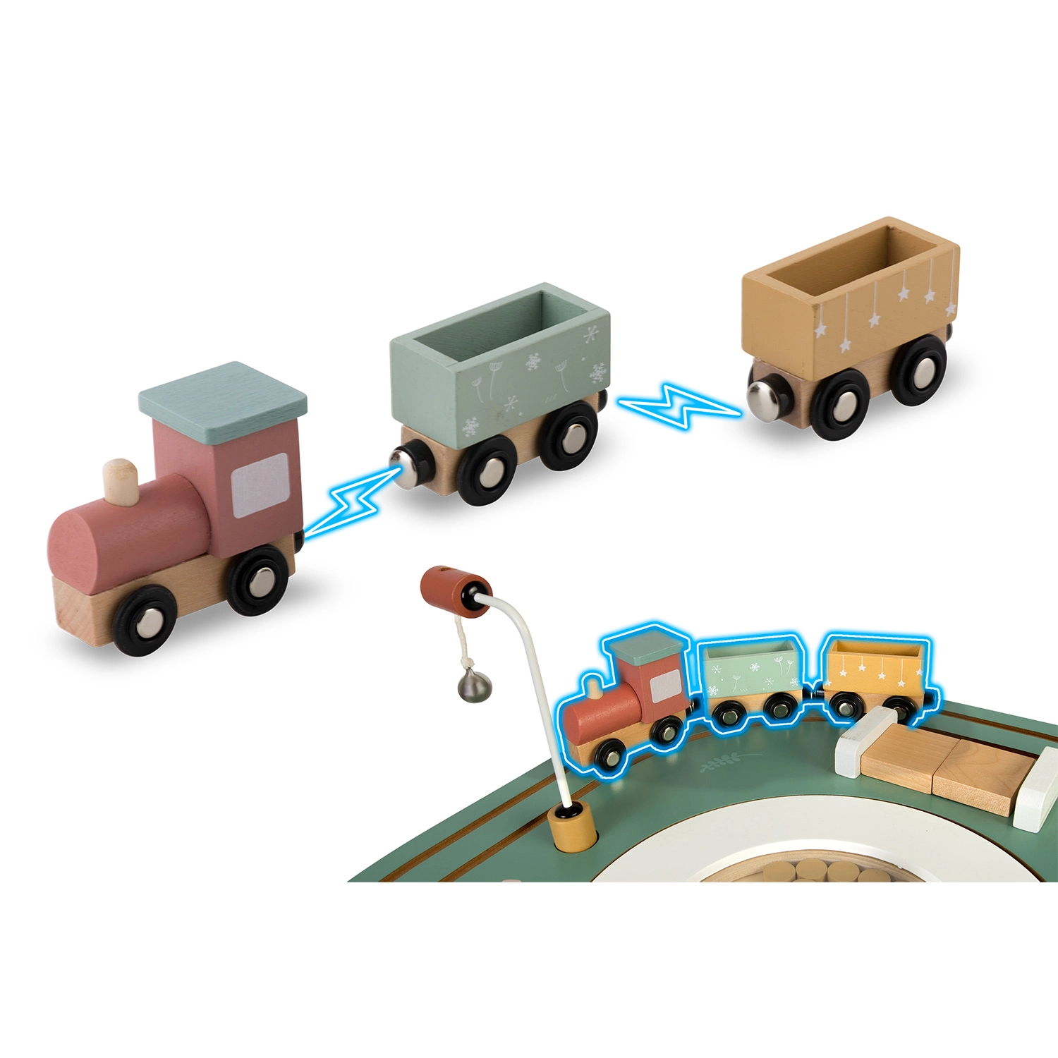 Die Lok mit magnetischen Waggons kann über die gesamte Tischplatte fahren. Kinder planen die Strecke, transportieren Tiere und fördern Vorstellungskraft sowie Feinmotorik.