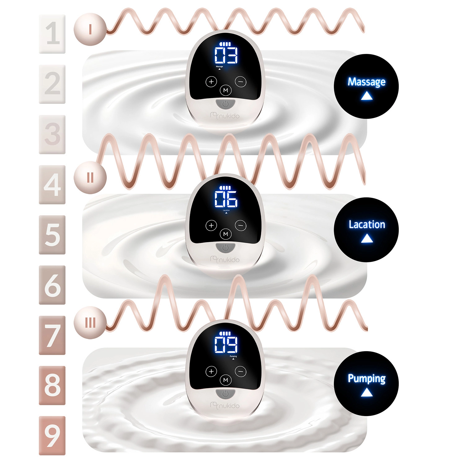 Die Nukido-Pumpe imitiert naturgetreu den natürlichen Saug rhythmus des Babys für ein effizientes und schonendes Abpumpen. Drei Modi (Stimulation, Saugen, tiefes Abpumpen) und 9 einstellbare Stufen ermöglichen eine schmerzfreie Anpassung an Ihre Bedürfnisse. Die massierende Silikoneinlage mit sanfter Haptik unterstützt den Milchspendereflex und erhöht den Komfort auch bei längerer Nutzung.