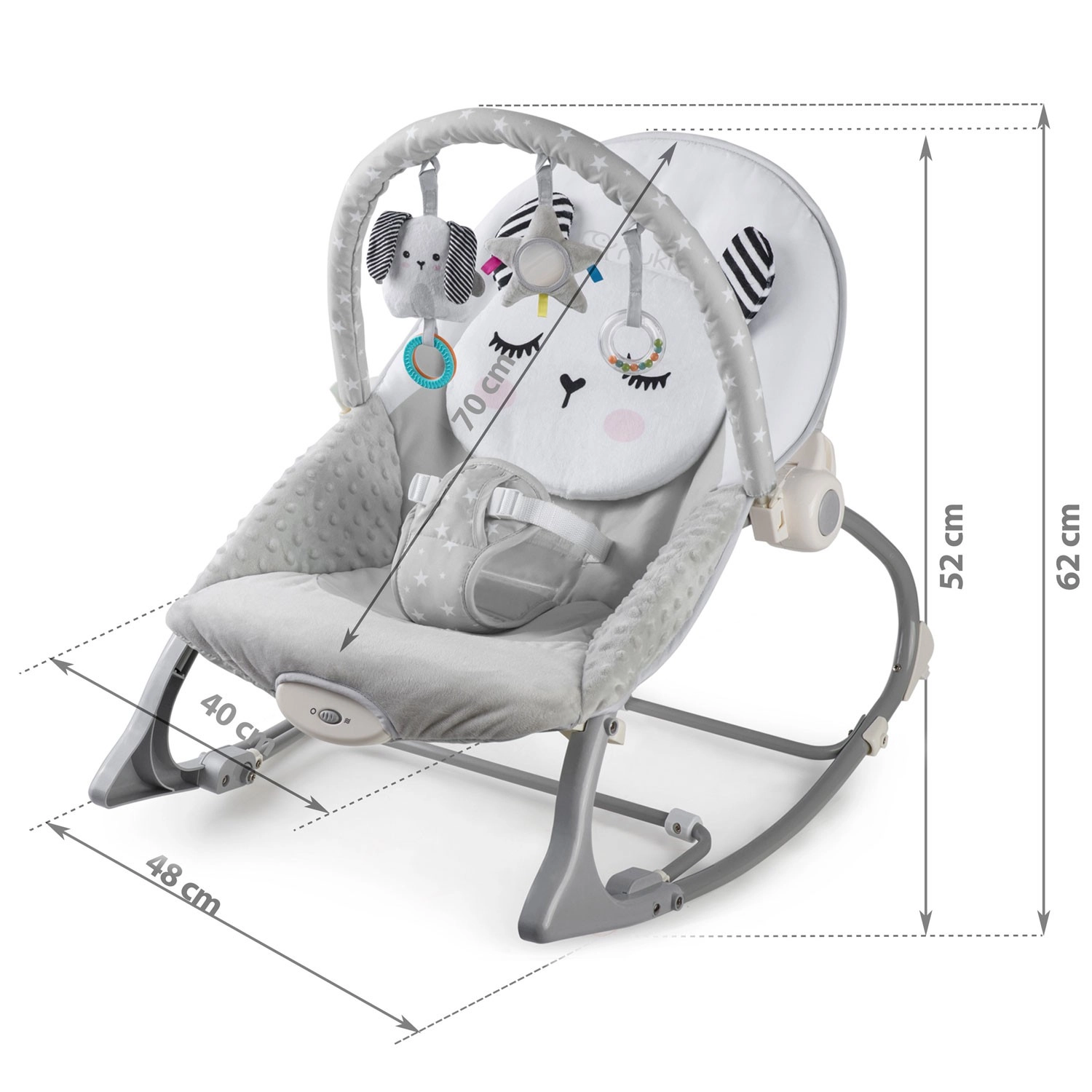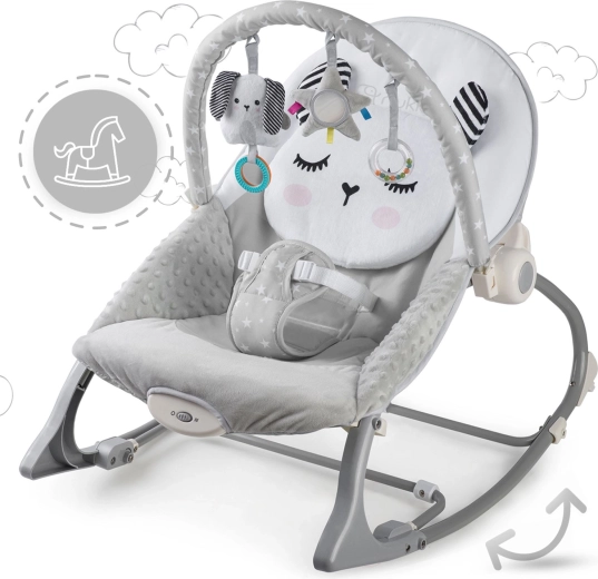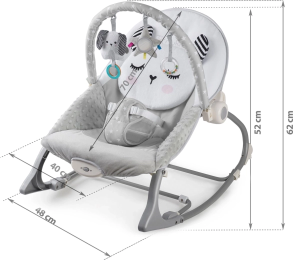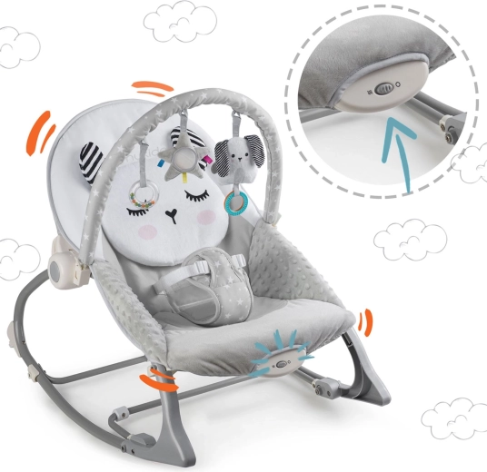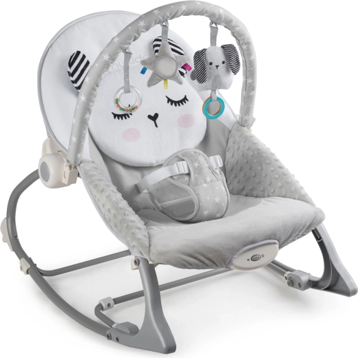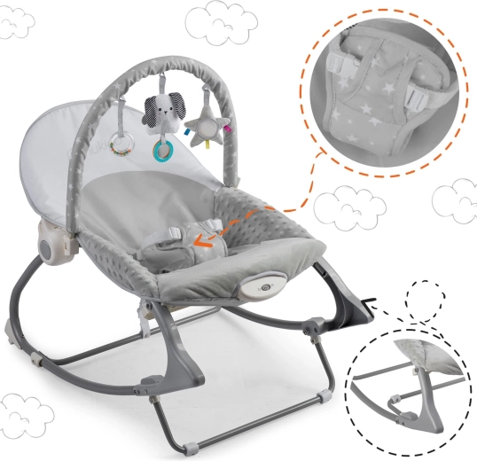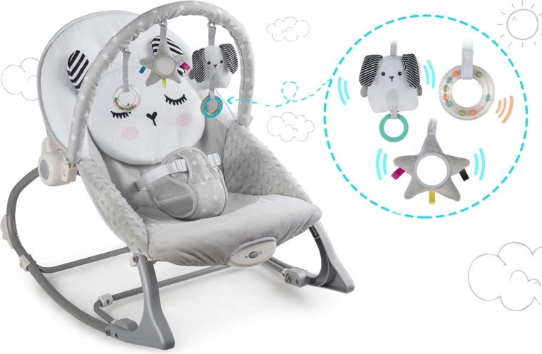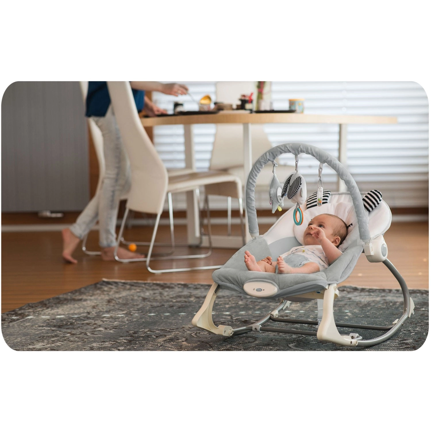 Der abnehmbare Spielbogen mit Plüschspielzeugen und Ringen fördert die sensorische Entwicklung, Sehen und Tastsinn. Spielzeuge lassen sich leicht umplatzieren oder durch Lieblings-Talismane des Kindes ersetzen. Die zweistufige Rückenlehnenverstellung passt die Position im Handumdrehen für Spiel oder Ruhe an. Rutschfeste Füße halten die Wippe sicher an Ort und Stelle und die Arretierung verwandelt die Wiege in einen festen Sitz.