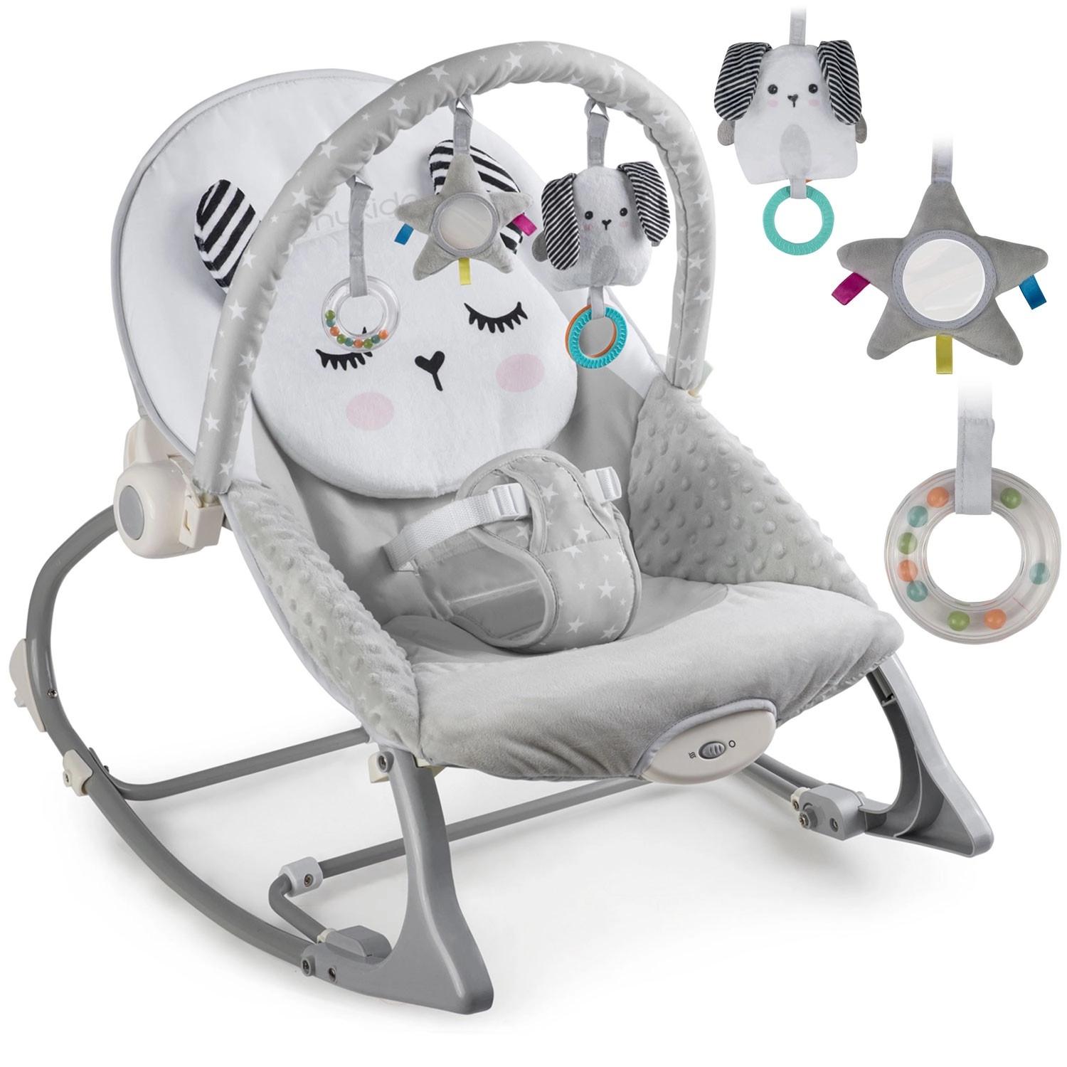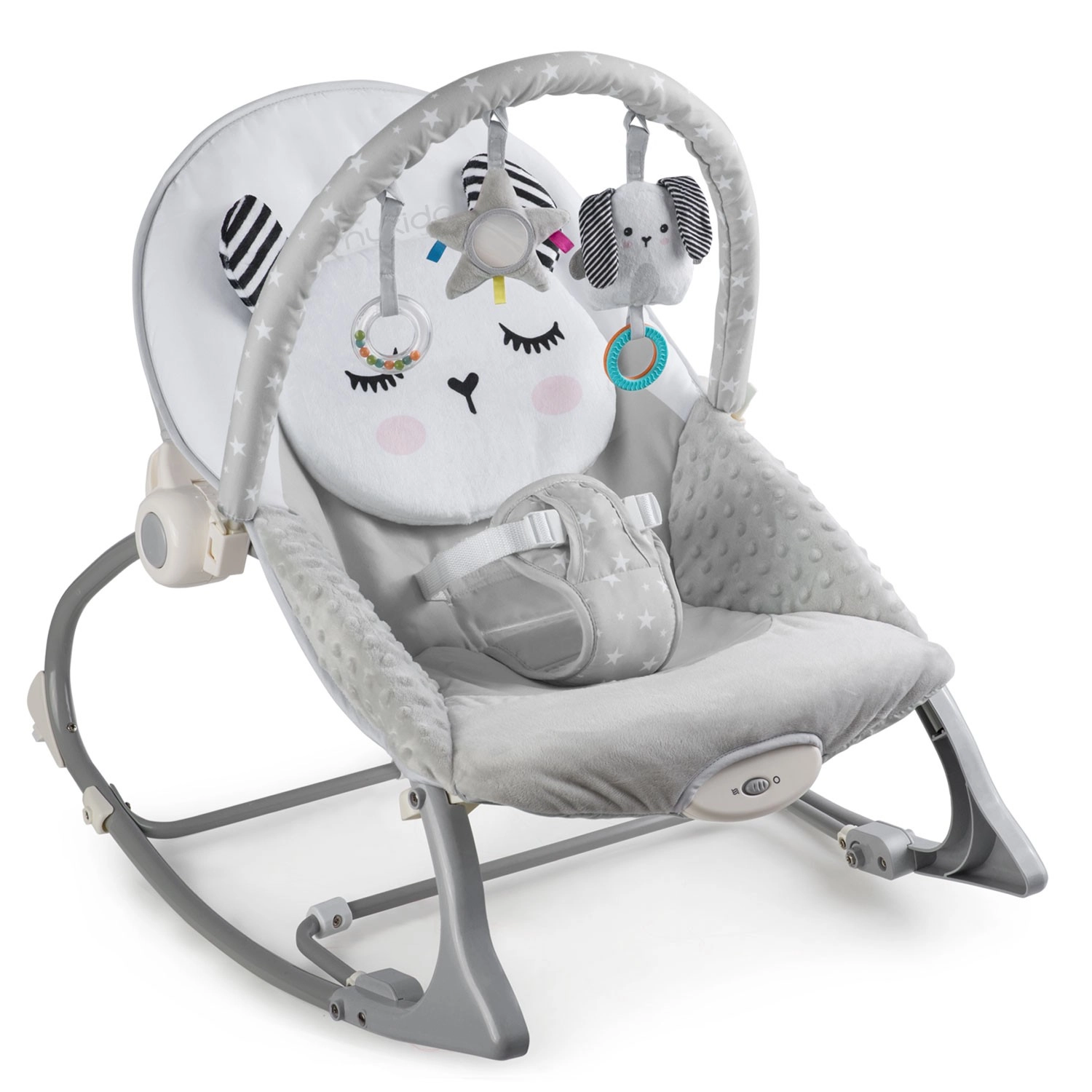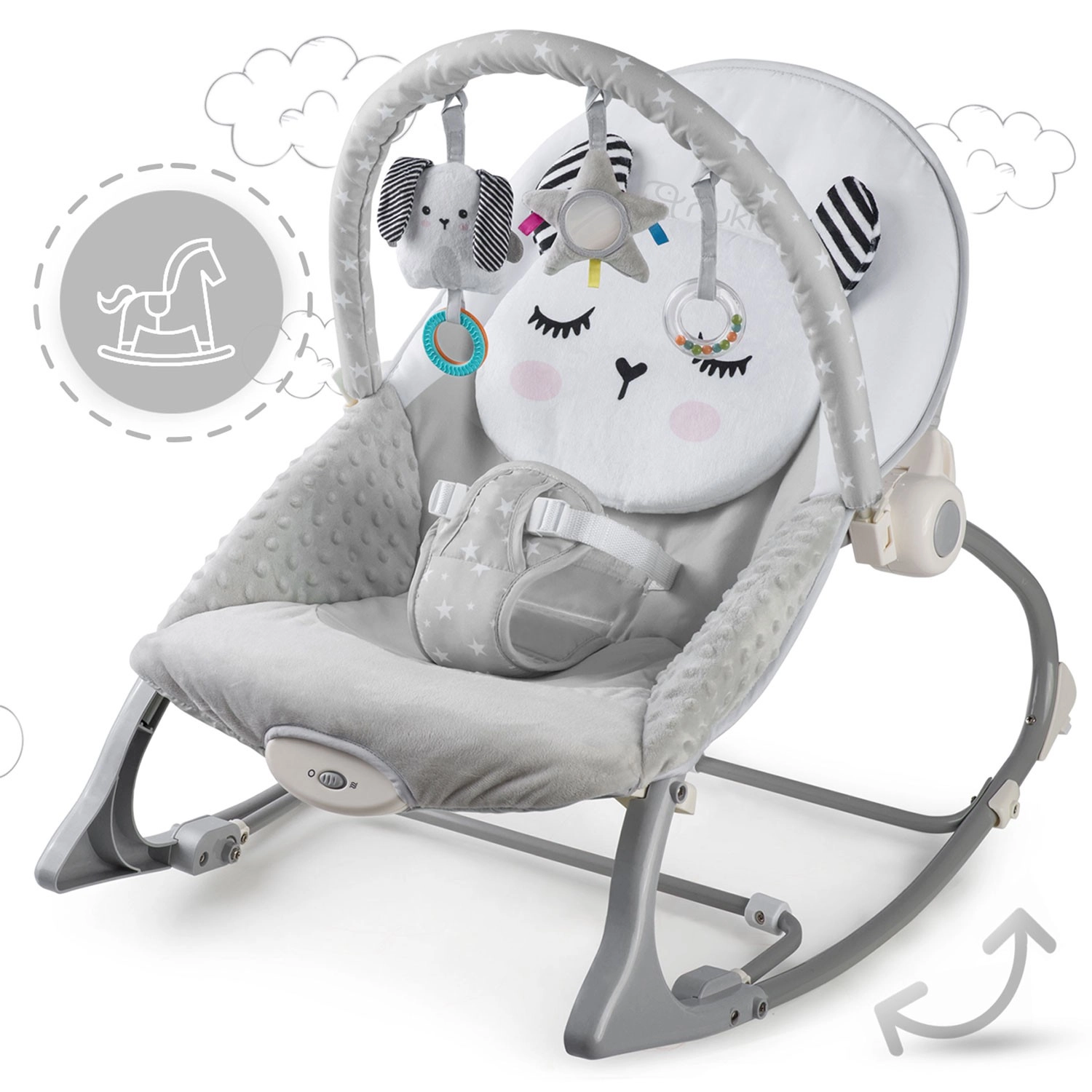 Der abnehmbare Spielbogen mit Plüschspielzeugen und Ringen fördert die sensorische Entwicklung, Sehen und Tastsinn. Spielzeuge lassen sich leicht umplatzieren oder durch Lieblings-Talismane des Kindes ersetzen. Die zweistufige Rückenlehnenverstellung passt die Position im Handumdrehen für Spiel oder Ruhe an. Rutschfeste Füße halten die Wippe sicher an Ort und Stelle und die Arretierung verwandelt die Wiege in einen festen Sitz.