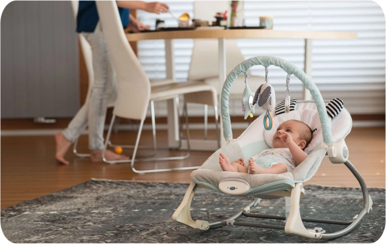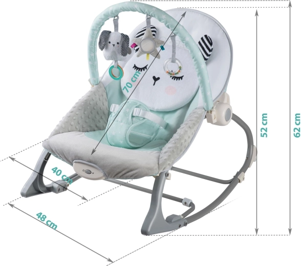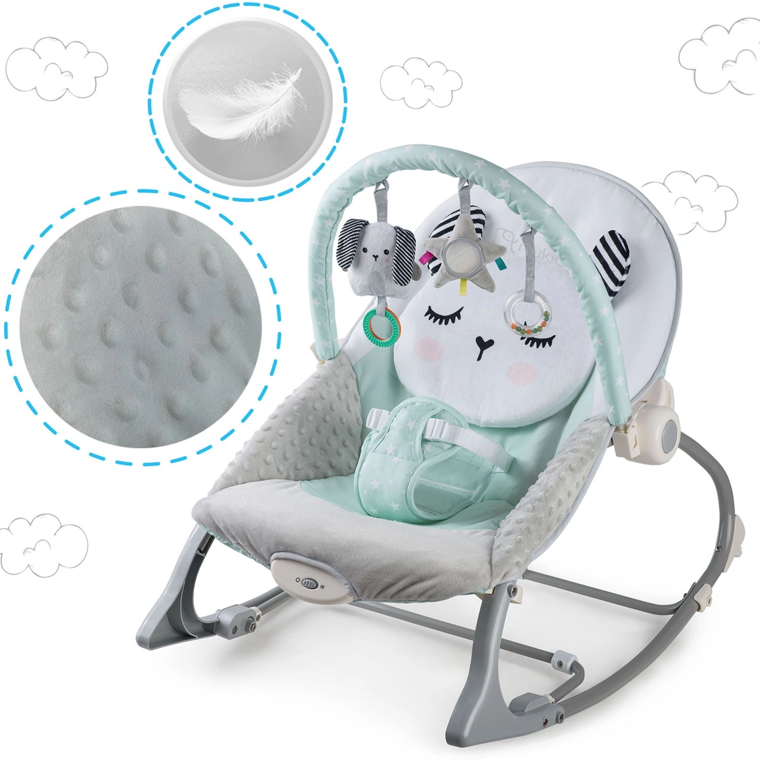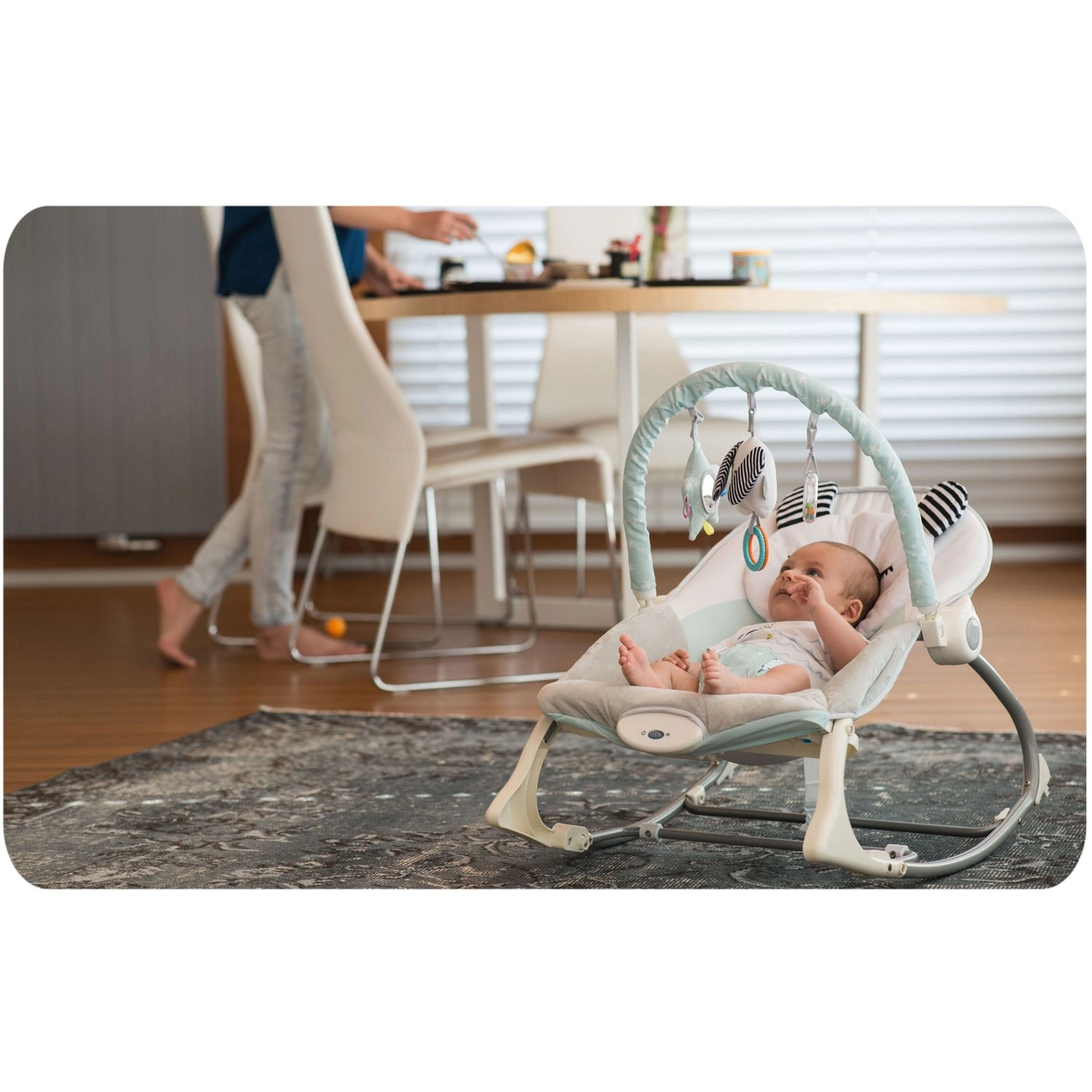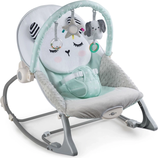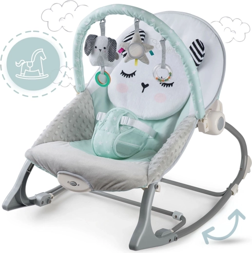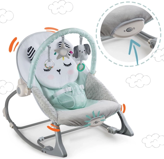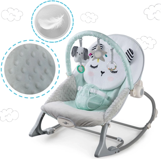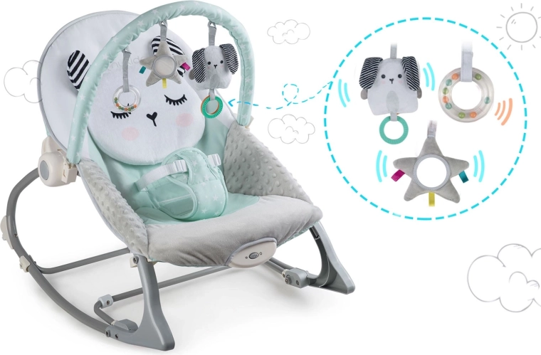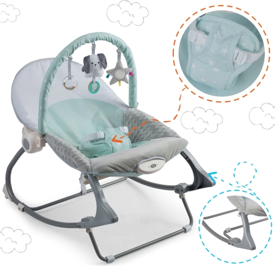 Der abnehmbare Spielbügel mit raschelnden Plüschspielzeugen fördert die Entwicklung von Sehen und Tastsinn. Weiche, angenehm zu berührende Bezüge sorgen für Komfort und lassen sich leicht abnehmen und per Hand waschen. Die stabile Konstruktion mit Metallrahmen und der Möglichkeit, das Schaukeln zu arretieren, erweitert die Nutzung je nach aktuellem Bedarf.