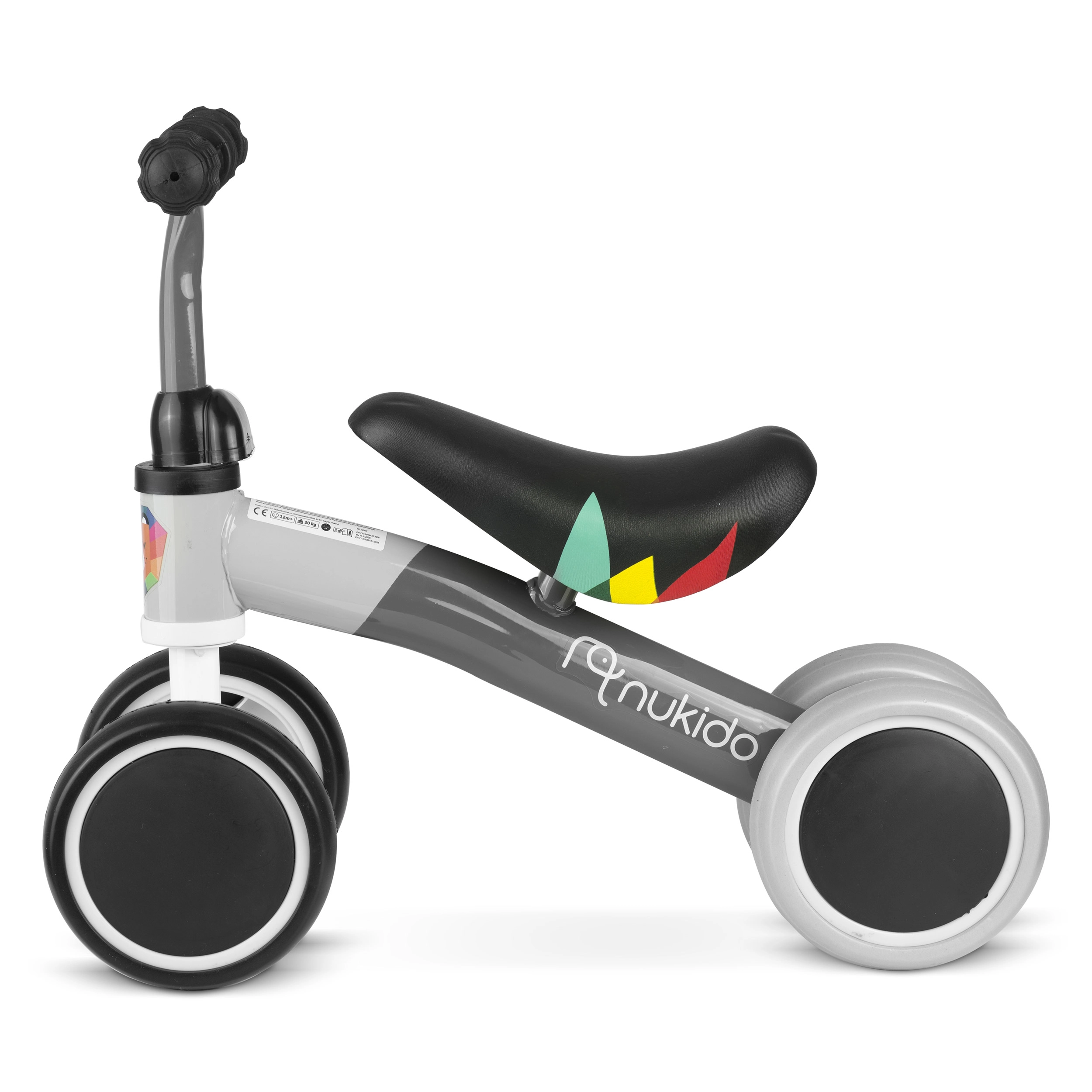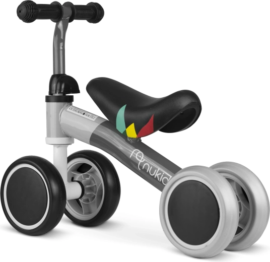 Das Laufrad mit 4 Rädern NUKIDO ist eine großartige Wahl für die ersten Fahrversuche Ihres Kindes. Dank des niedrigen Rahmens und der stabilen Vier-Rad-Basis stoßen sich kleine Fahrer leicht ab, trainieren das Gleichgewicht und gewinnen Selbstvertrauen. Die Metallkonstruktion sorgt für Langlebigkeit, während der gepolsterte Sattel und Gummigriffe mit Anschlägen zusätzlichen Komfort und Sicherheit bieten.