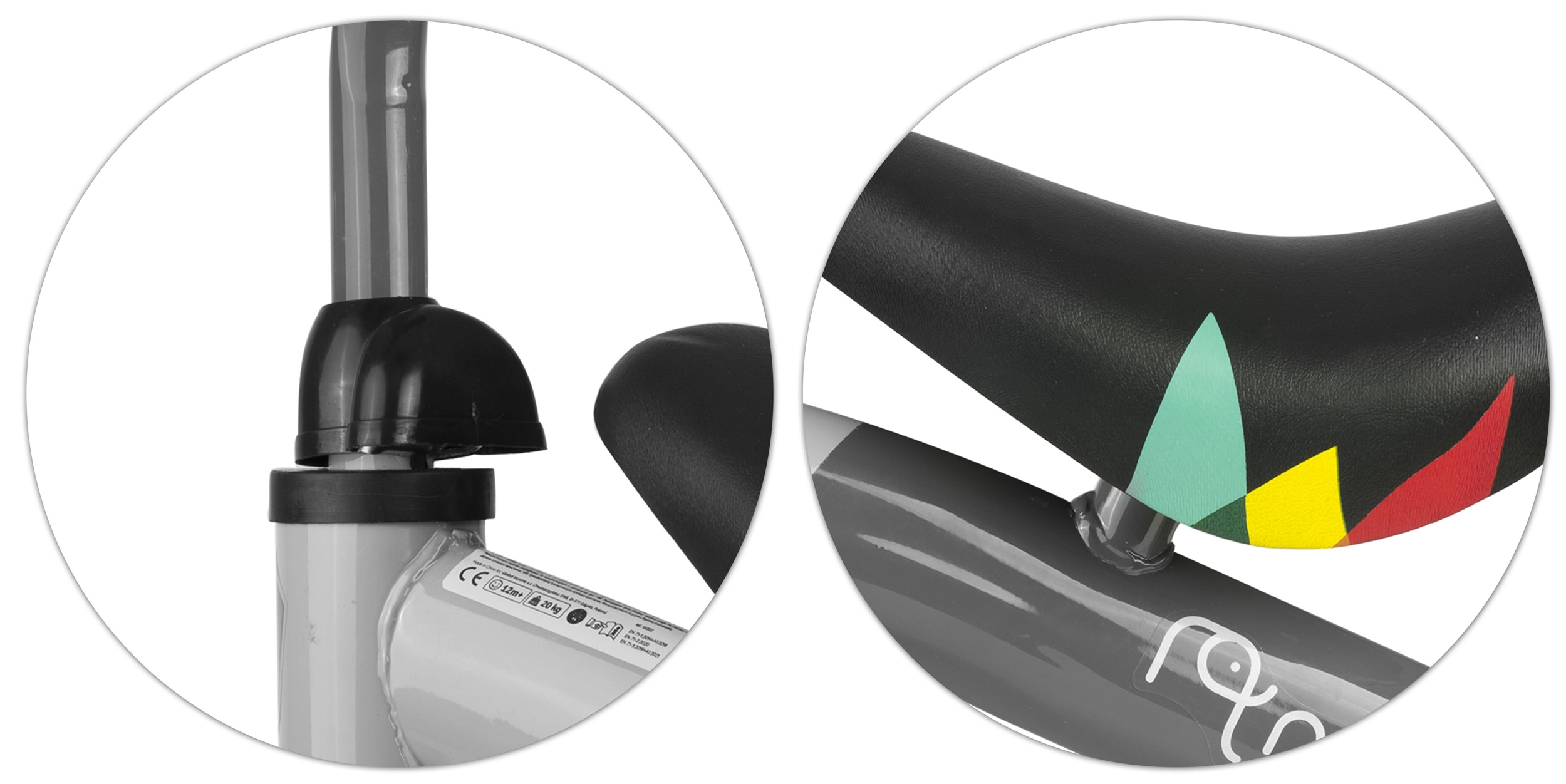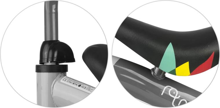 Der Schaumsattel dämpft Unebenheiten und gummierte Griffe mit Anschlägen sorgen für einen sicheren Halt kleiner Hände.
