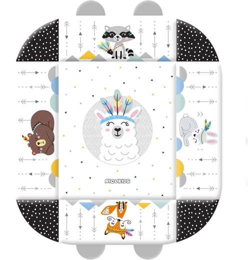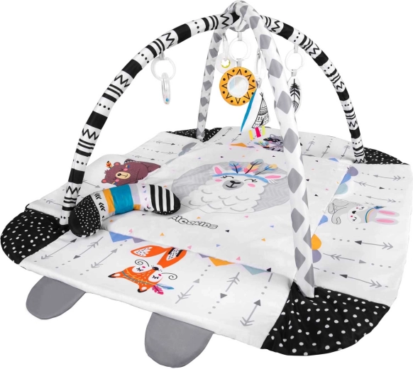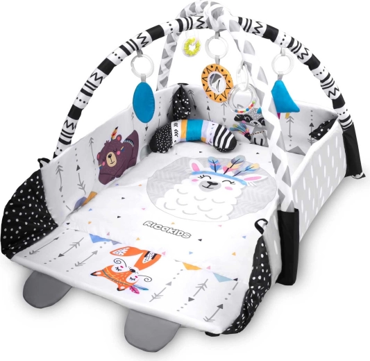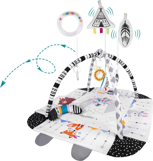 Die RICOKIDS Boho Spielmatte 110 × 100 cm schafft ein gemütliches und sicheres Nest für tägliches Entdecken. Zwei sich kreuzende Spielbögen mit abnehmbaren hängenden Spielzeugen (Rasseln, Beißringe, Spiegel) fördern visuelles Folgen, die Hand-Auge-Koordination und die Feinmotorik. Weiche Polsterung und hochklappbare Seiten sorgen für Komfort und Schutz beim Spielen, während kontrastreiche und tierische Motive für visuelle Stimulation sorgen.