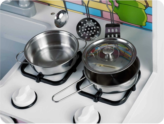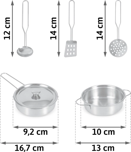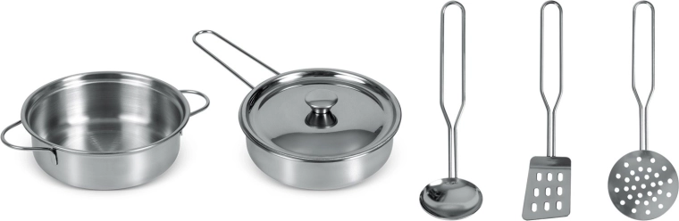 Lieferumfang: kleiner Topf mit Griffen, Kasserolle mit Deckel und langem Stiel, Schöpflöffel, Loch-Wender und Lochlöffel/Sieb. Das Metallzubehör ist langlebig, pflegeleicht und passt perfekt zu Kinderküchen, einschließlich Modellen der Marke RICOKIDS.