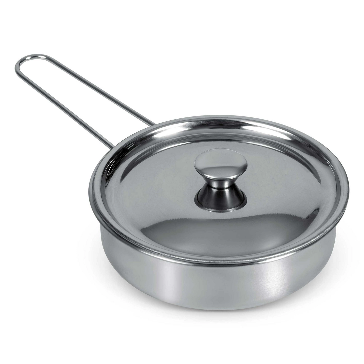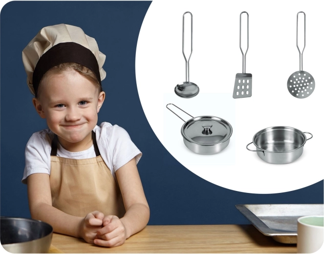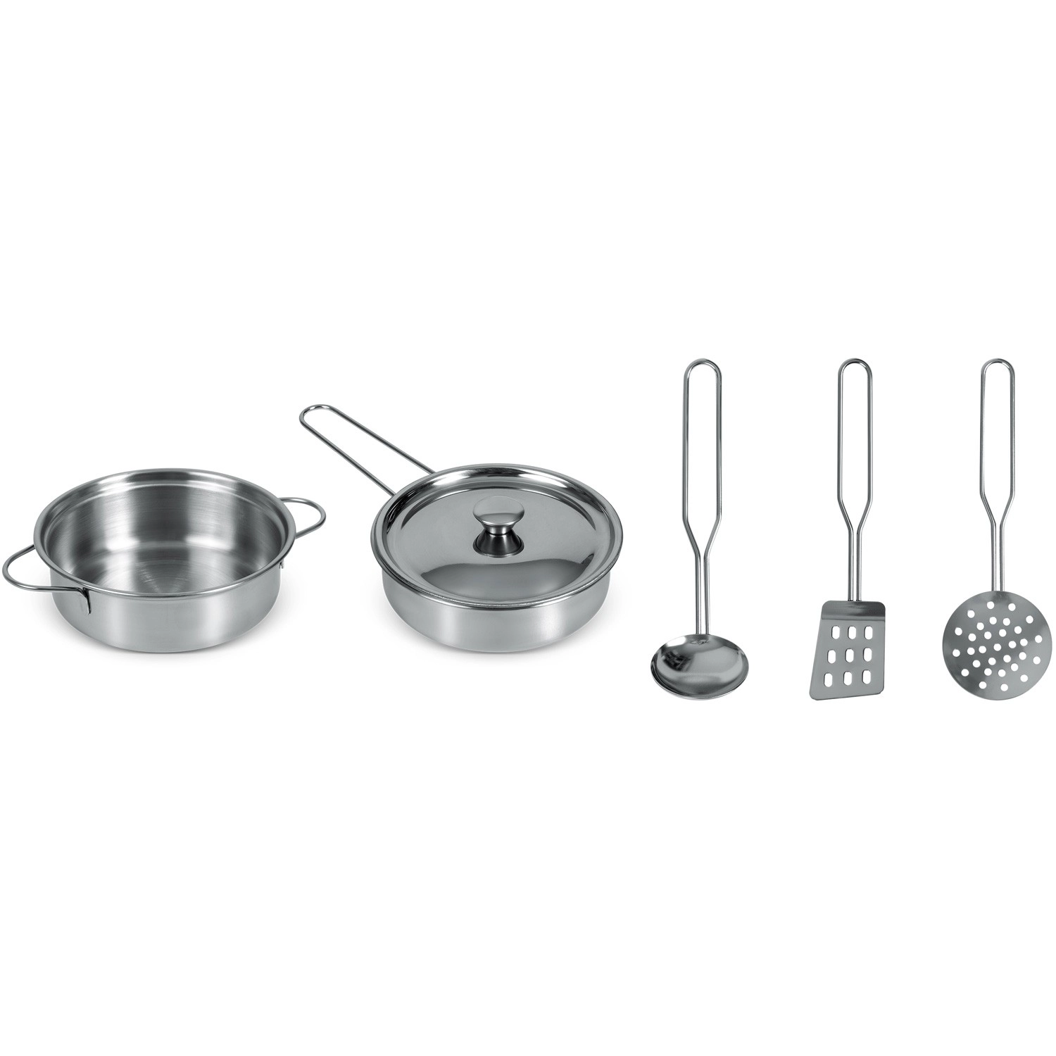 Topf, Stielkasserolle mit Deckel und drei nützliche Werkzeuge im Kinderformat – alles aus strapazierfähigem Edelstahl mit glänzender Oberfläche für authentisches Kochspiel.