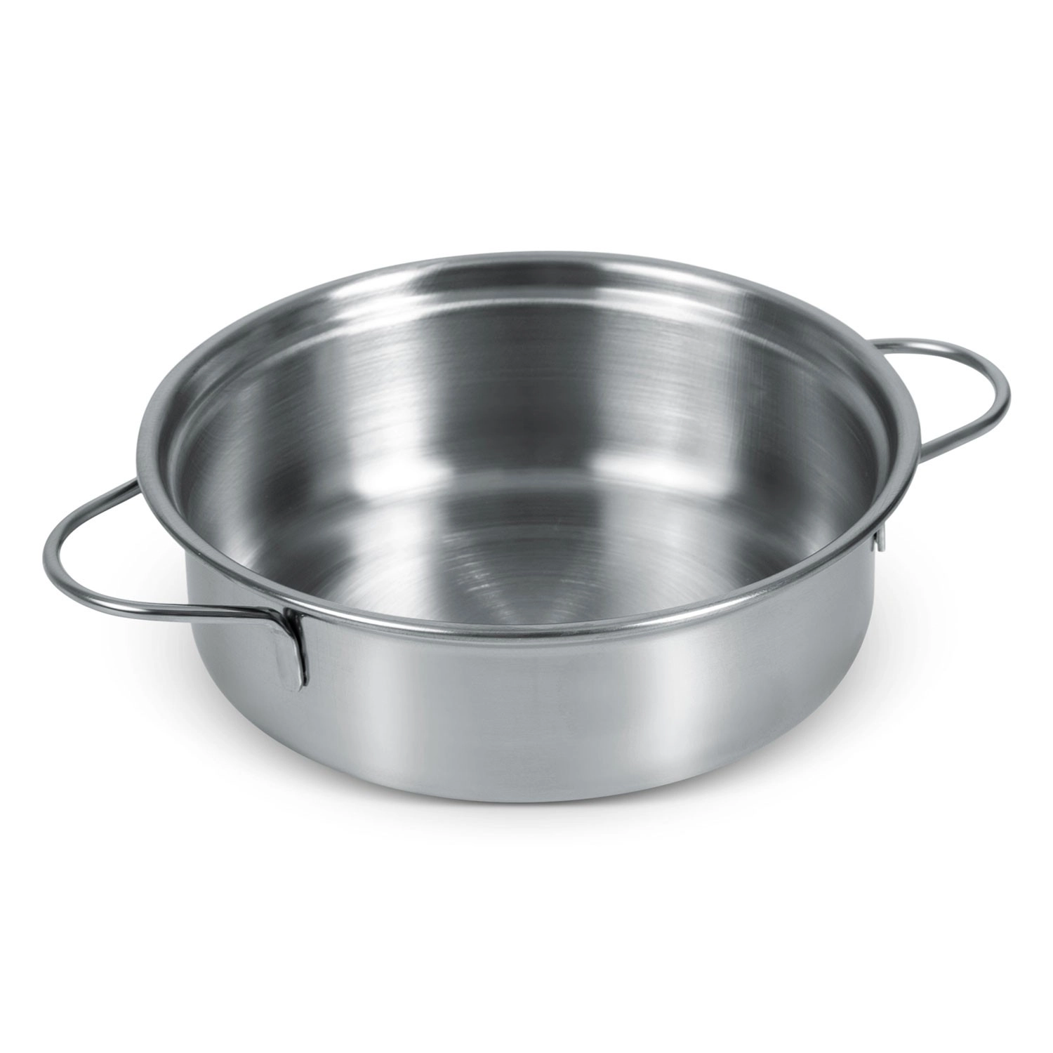 Breiter Edelstahltopf mit seitlichen Griffen – ideal zum „Suppe kochen“, Rühren und leicht zu halten auch für kleine Hände.