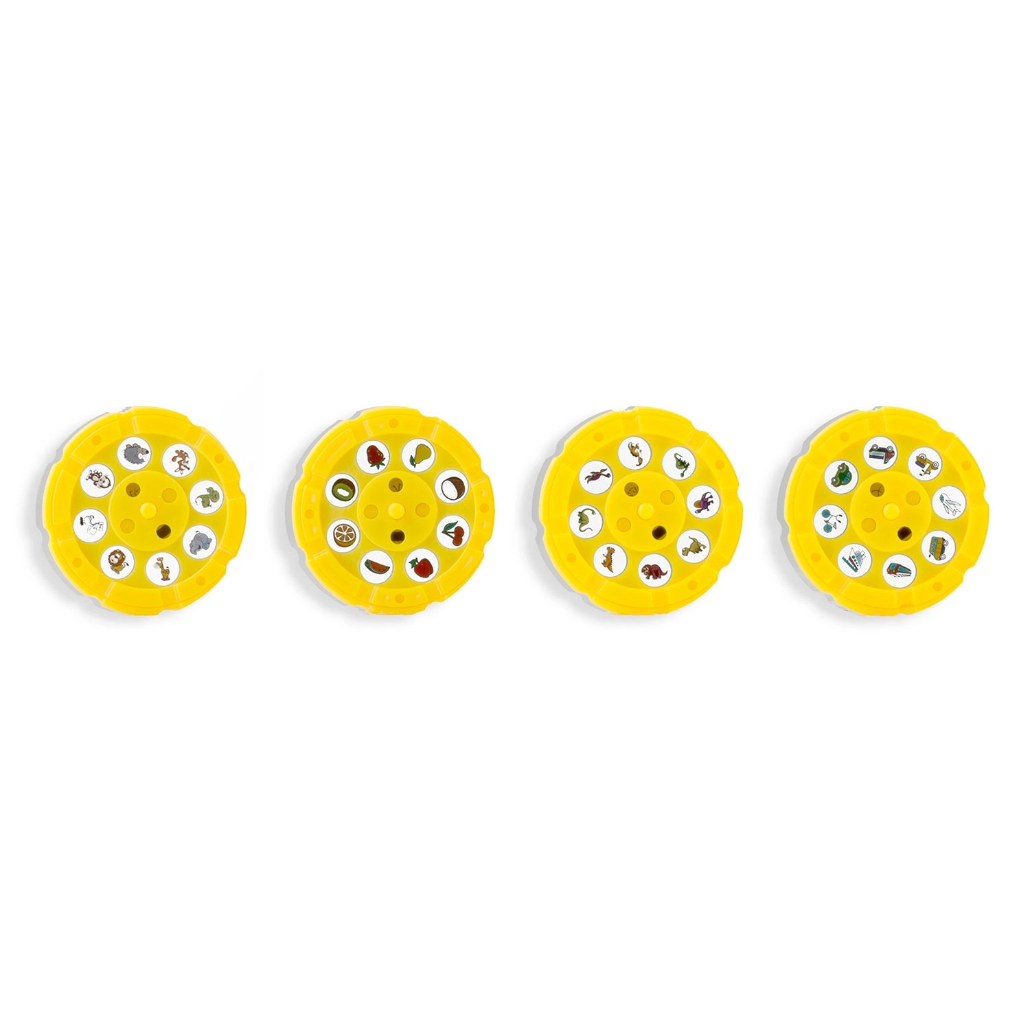 Vier gelbe Discs bieten Themenwelten (Dinosaurier, Fahrzeuge, Obst und Gemüse, Tiere). Kinder wählen einfach ein Motiv aus und projizieren die Vorlage zum Nachzeichnen und Ausmalen.