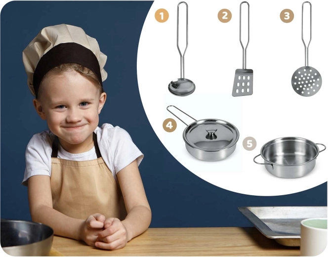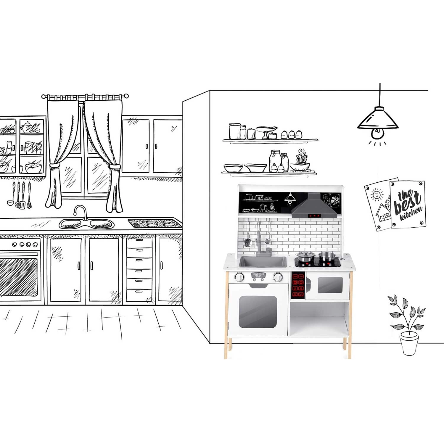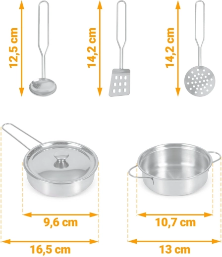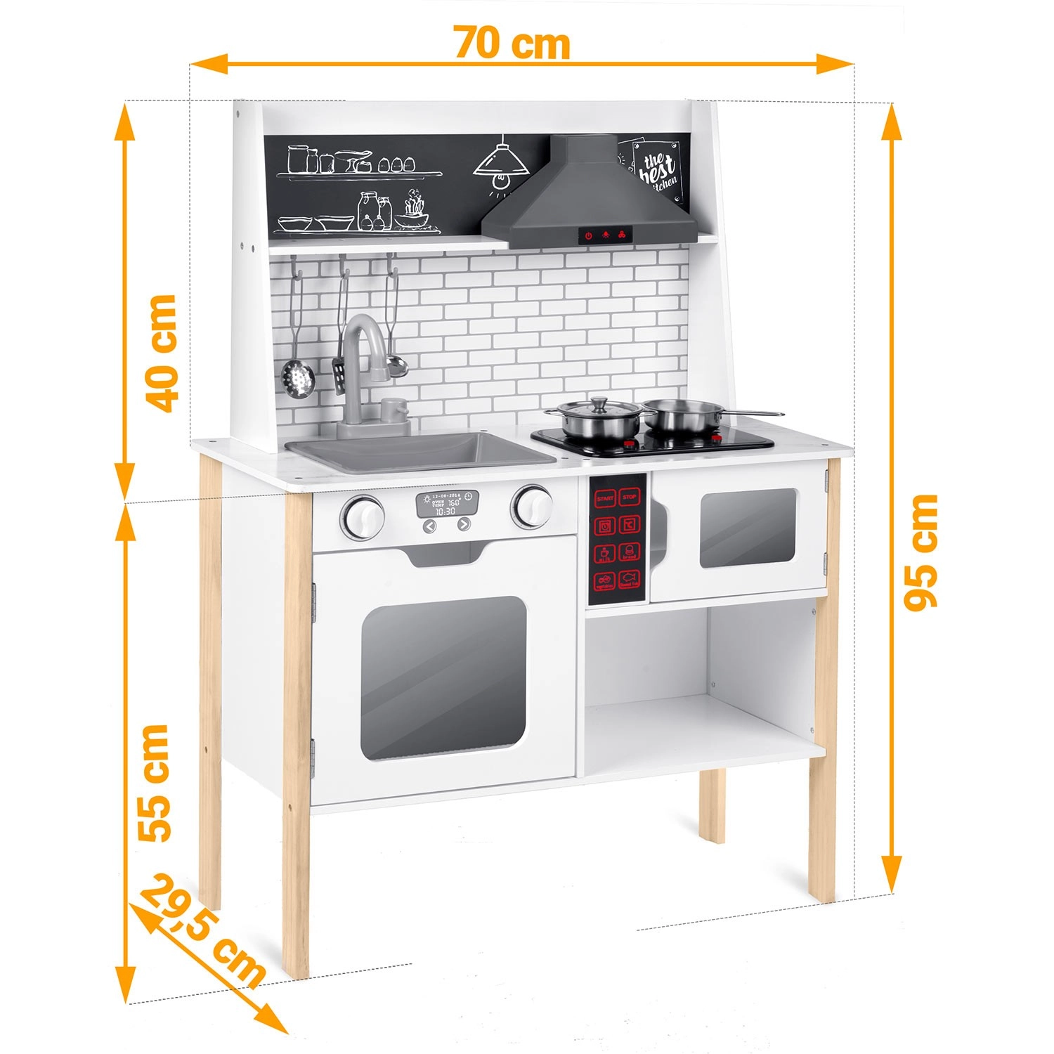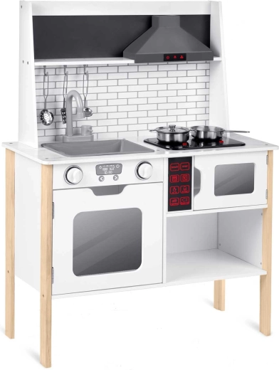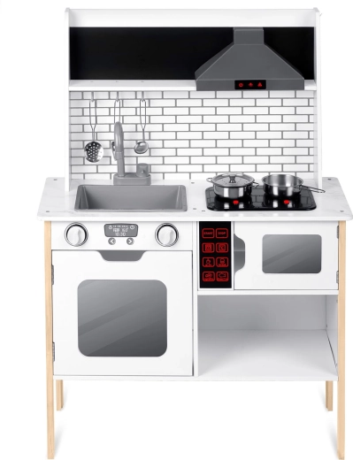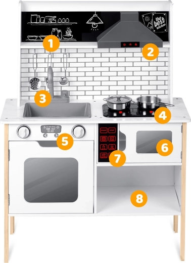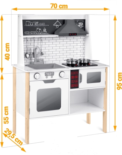 Umfangreiches Zubehör inklusive: Stielkasserolle, Topf, Sieb, Schöpflöffel, Pfannenwender und Deckel. Kinder können mit Kreide das Menü auf die Tafelfläche schreiben, Teamarbeit und soziale Fähigkeiten üben und Tätigkeiten der Erwachsenen sicher nachahmen – vom Abwasch bis zum Backen im Ofen.