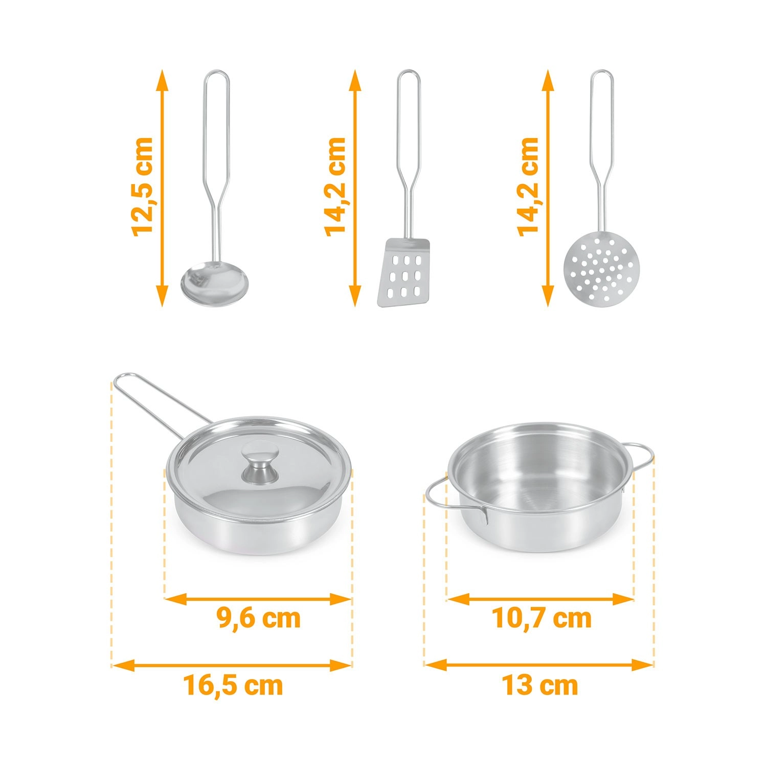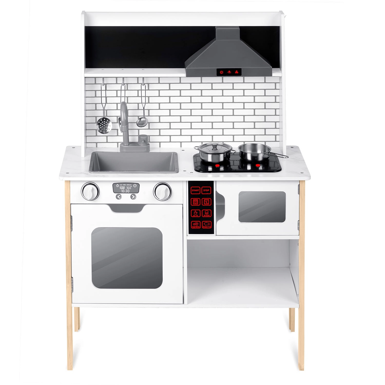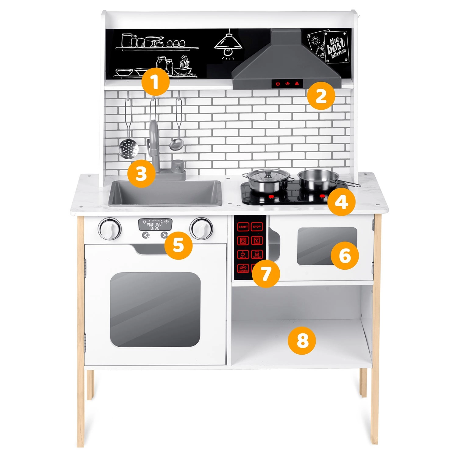 Umfangreiches Zubehör inklusive: Stielkasserolle, Topf, Sieb, Schöpflöffel, Pfannenwender und Deckel. Kinder können mit Kreide das Menü auf die Tafelfläche schreiben, Teamarbeit und soziale Fähigkeiten üben und Tätigkeiten der Erwachsenen sicher nachahmen – vom Abwasch bis zum Backen im Ofen.