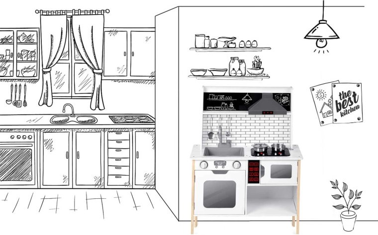 Die Spielküche RICOKIDS RC-846 ist ein durchdachtes Holz-Set, das das Kinderzimmer in ein kleines Restaurant verwandelt. LED-Beleuchtung der Dunstabzugshaube und Mikrowelle, leuchtende Kochfelder mit Sound sowie ein Bedienfeld mit Geräuschen sorgen für ein authentisches Kocherlebnis. Die minimalistische, stabile Konstruktion passt hervorragend in moderne Innenräume und hält dank hochwertiger Materialien jahrelangem Spiel stand.
