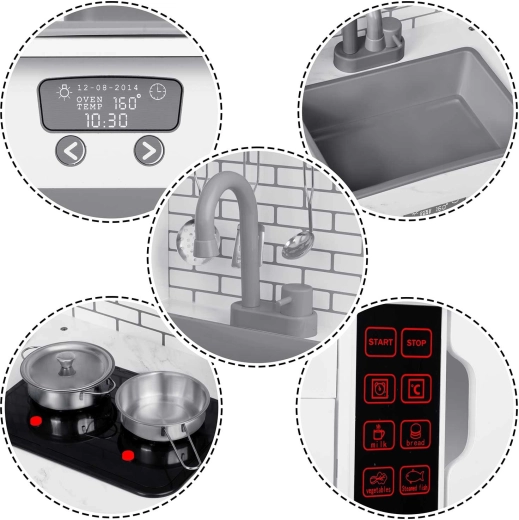 Hauptvorteile für Eltern: leise, angenehme Sound-Signale, sicher abgerundete Formen und EN-71-Zertifizierung. Die Küche ist schnell aufgebaut und leicht zu pflegen – die herausnehmbare Schüssel im Spülbecken erlaubt etwas Wasser zum Spielen, das nach dem Spiel einfach ausgeschüttet werden kann.