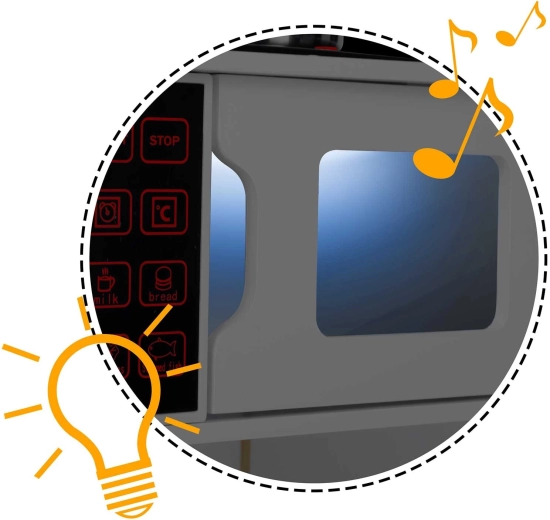 Integriertes LED-Licht und Tasten an der Haube verleihen dem Kochspiel eine realistische Atmosphäre und bringen Kindern die Grundlagen der Gerätebedienung näher.