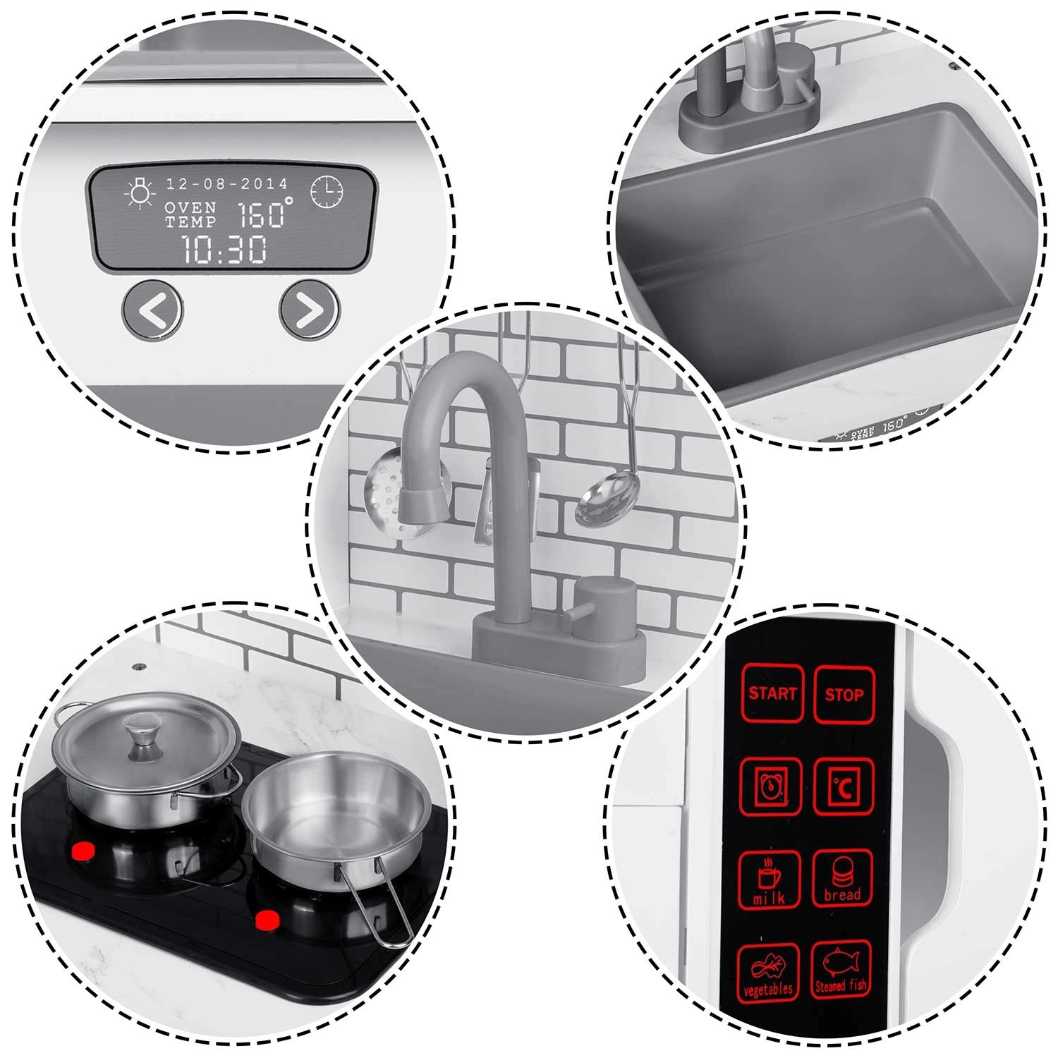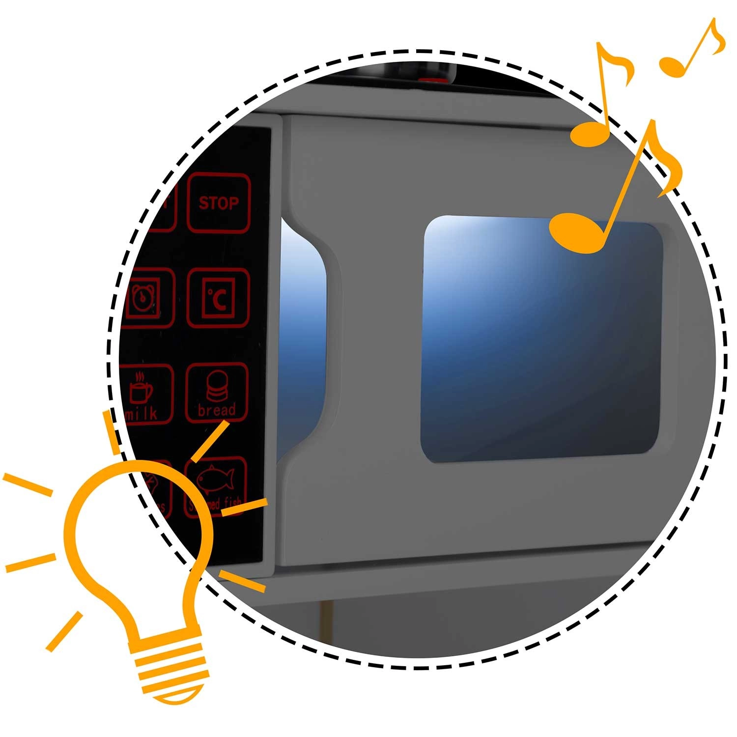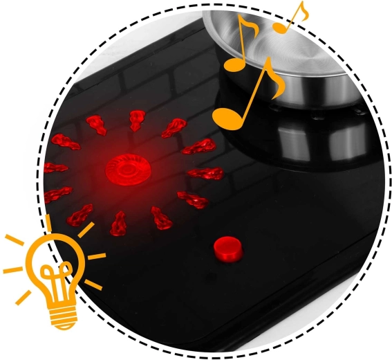 Nach dem Drücken der Taste leuchten die Kochfelder auf und geben sanfte Kochgeräusche wie z. B. Wasserblubbern von sich – ein unterhaltsames und sicheres Imitat einer echten Küche.