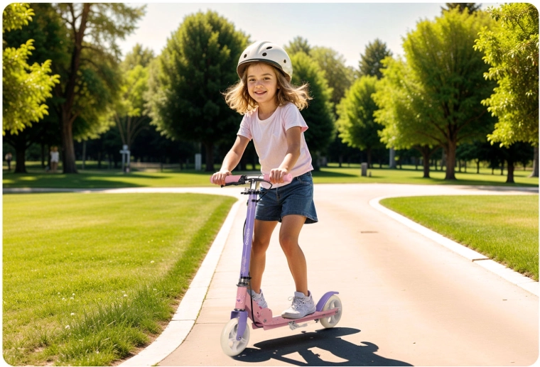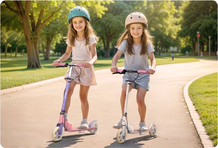Die großen PU-Räder 145 x 30 mm mit Härte 83A dämpfen Unebenheiten sehr gut und laufen dank ABEC‑7-Lagern besonders glatt und leise. Das doppelte Bremssystem – vordere Handbremse für schnelle Reaktionen und Fußbremse am hinteren Schutzblech – gibt Kindern Sicherheit in jeder Situation. Nicht fehlen dürfen höhenverstellbare Lenker und ein praktischer Ständer für stabiles Parken.