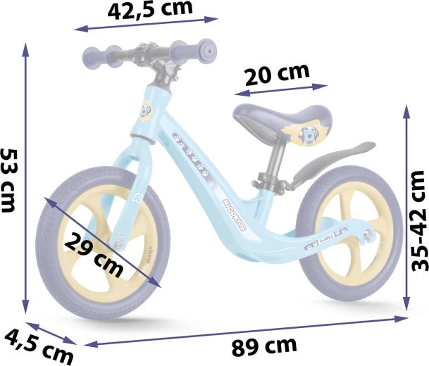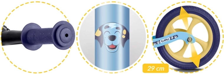Der ergonomisch geformte, weiche Schaumstoffsattel mit stufenloser Höhenverstellung (ca. 35–42 cm) wächst mit dem Kind mit und ermöglicht komfortables Fahren in jeder Entwicklungsphase. Gummigriffe mit Endkappen schützen die Hände und verbessern die Griffsicherheit. Das Laufrad fördert Selbstvertrauen, Konzentration und den natürlichen Übergang auf ein klassisches Fahrrad mit Pedalen.
