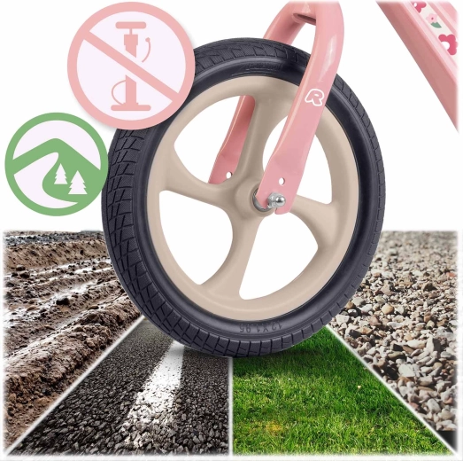 Die EVA-Schaumräder sind leise, unempfindlich gegen Reifenpannen und behalten ihre Form bei Kälte wie bei Sonne. Sie dämpfen Unebenheiten hervorragend und rollen gut auf verschiedenen Untergründen.