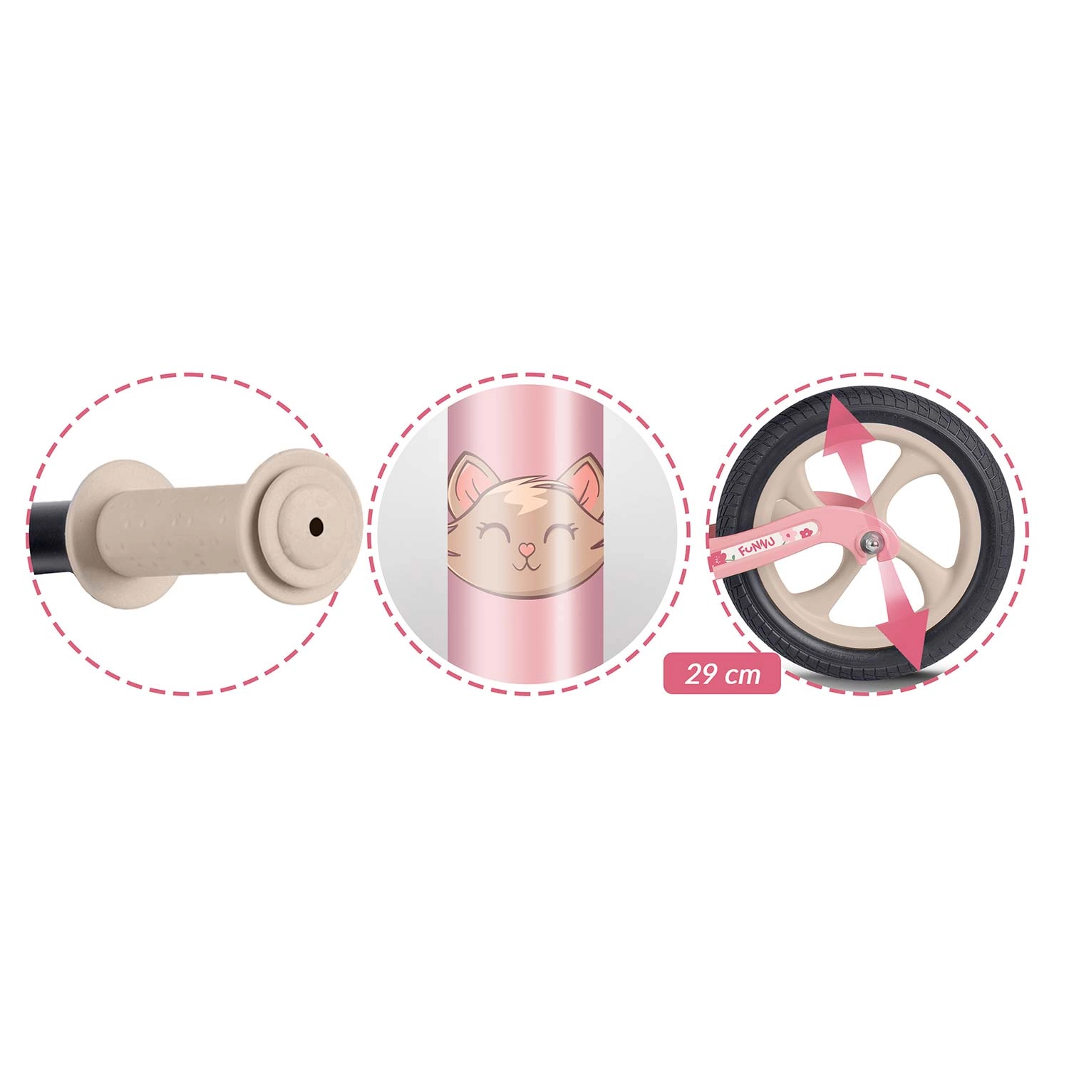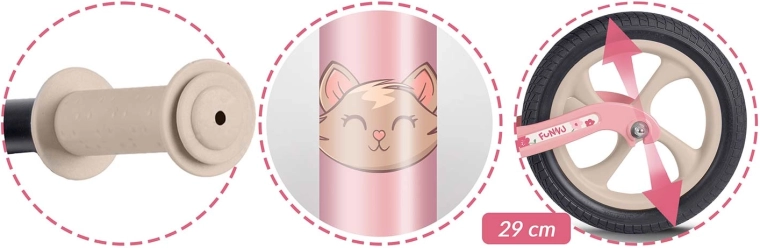 Sicherheit und Komfort stehen an erster Stelle: rutschfeste Griffe mit Stoppern bieten Kontrolle über die Lenkung, der weiche Schaumsattel schont Rücken und Po, und die breiten Lenker unterstützen die Stabilität. Das Laufrad fördert die natürliche Entwicklung von Gleichgewicht, Koordination und Konzentration – der Umstieg auf ein klassisches Fahrrad mit Pedalen wird dadurch zum Kinderspiel.