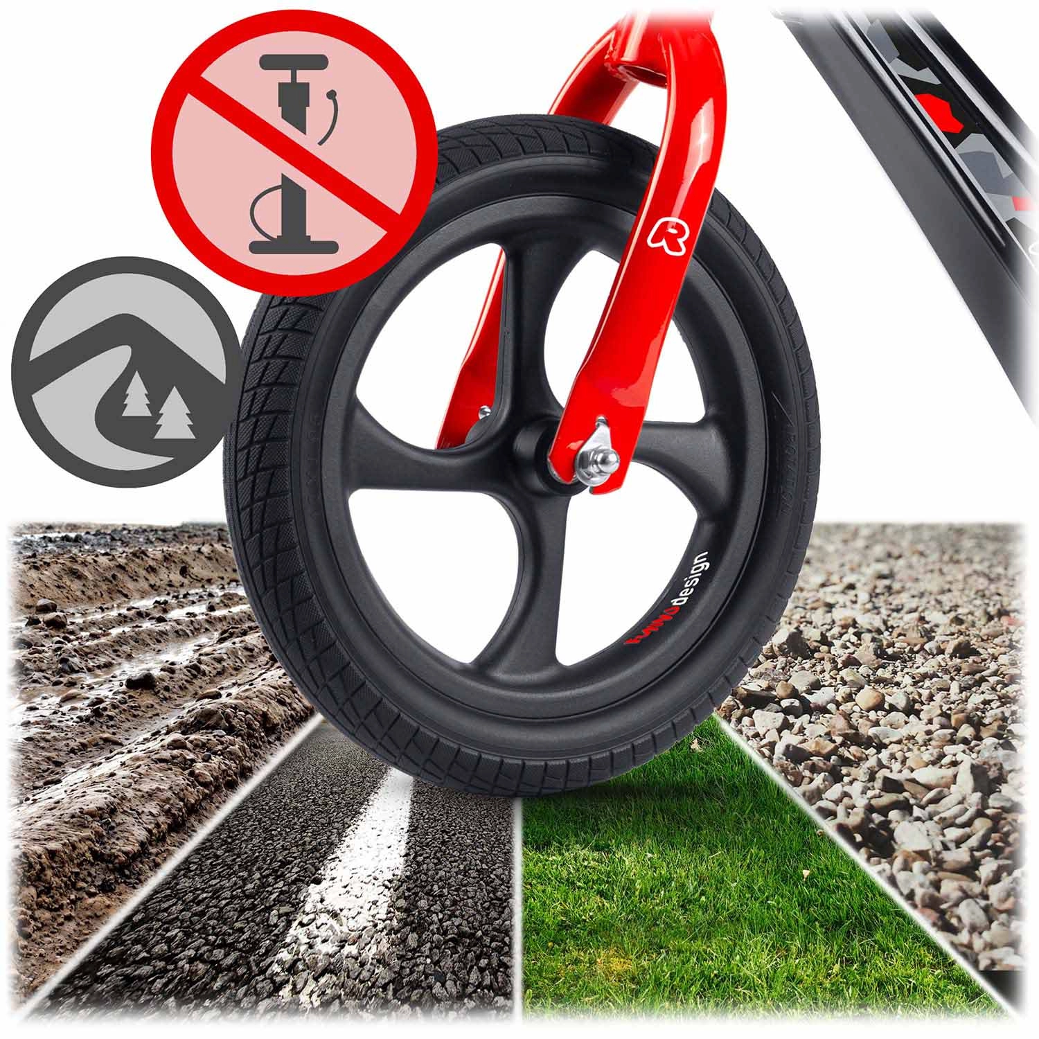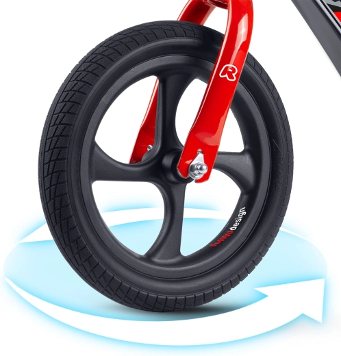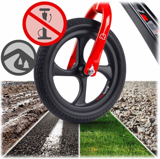 Die robusten 12"-Räder aus EVA-Schaum benötigen kein Aufpumpen, können nicht durchstochen werden und dämpfen Unebenheiten hervorragend. Sie lassen sich leicht reinigen und laufen leise auf verschiedenen Untergründen.