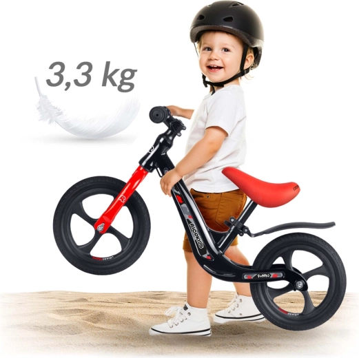 Die Magnesiumkonstruktion ist stabil und zugleich sehr leicht, sodass sich das Laufrad einfach manövrieren und tragen lässt. Ideal für kleine Fahrerinnen und Fahrer sowie Eltern unterwegs.