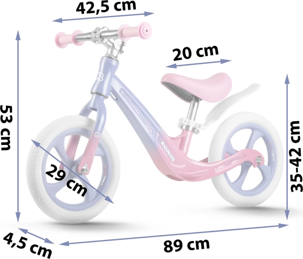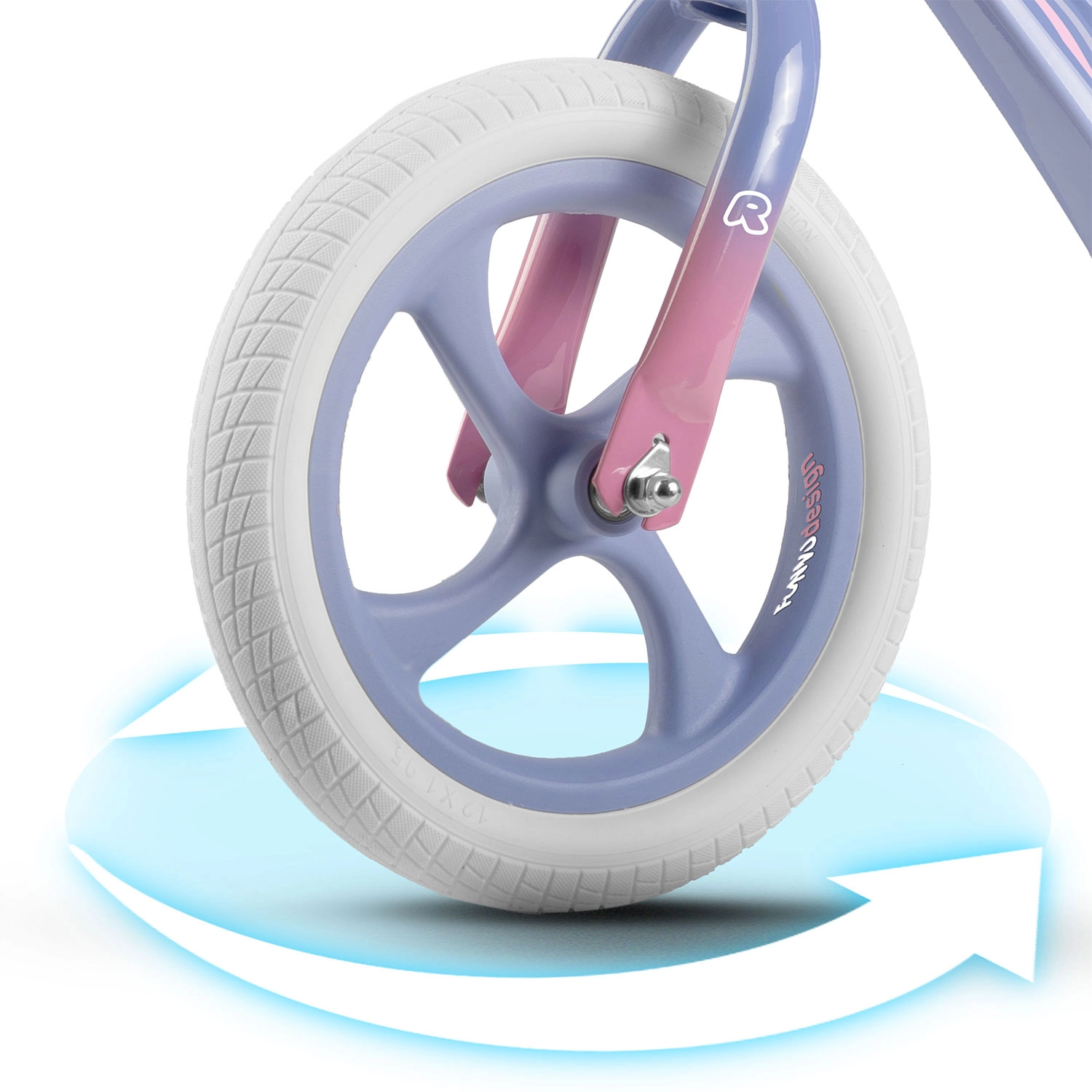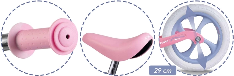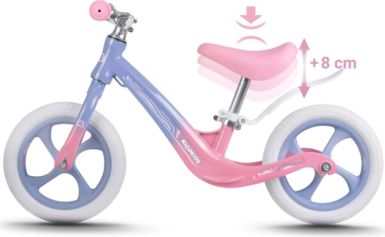 Das Ricokids Funnu ist ein Laufrad, das den Übergang auf ein klassisches Fahrrad mit Pedalen erleichtert. Der Magnesiumrahmen bietet außergewöhnliche Leichtigkeit und Stabilität, während die EVA-Schaumreifen kein Aufpumpen benötigen und unempfindlich gegenüber Durchstichen, Feuchtigkeit und niedrigen Temperaturen sind. Der ergonomische, weich gepolsterte Sattel mit großem Verstellbereich sorgt in jeder Wachstumsphase für Komfort.