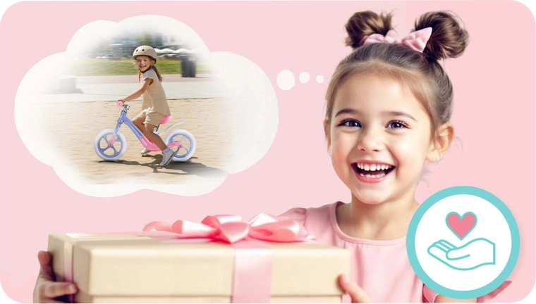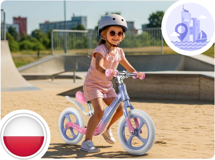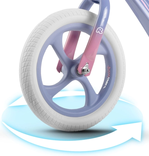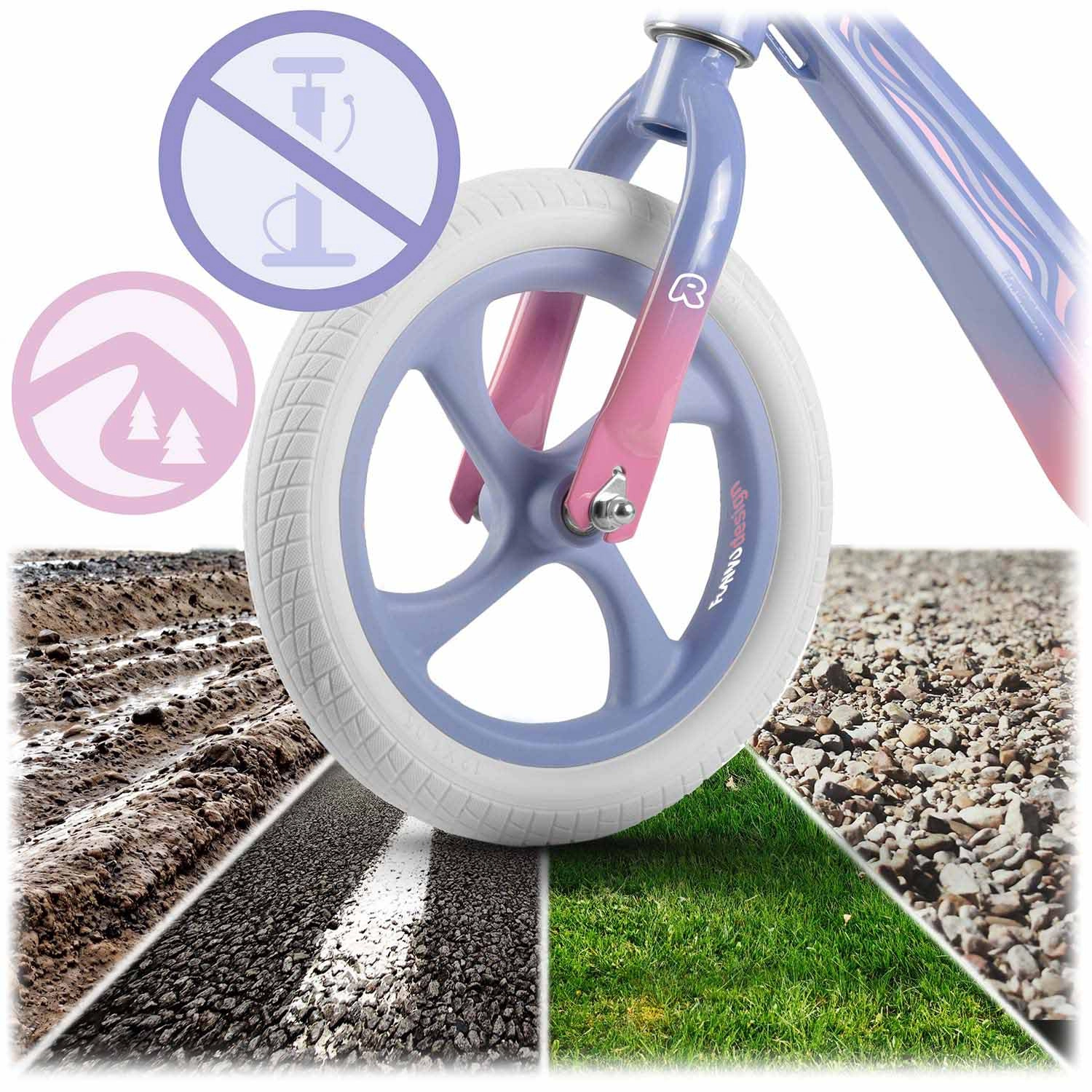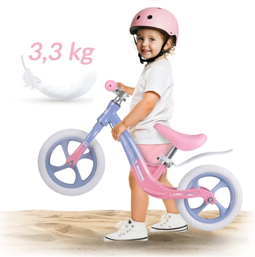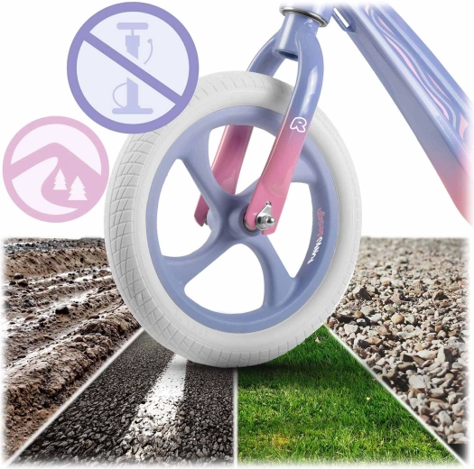 Für eine sicherere und souveränere Fahrt gibt es breite Lenker mit rutschfesten Griffen und Endstopfen, die die Kinderhände schützen. Große 12"-Räder gewährleisten eine ruhige und leise Fahrt drinnen und draußen – auf Rasen, Asphalt und befestigten Wegen. Dank der kompakten Bauweise ist das Laufrad leicht zu tragen und ideal für den täglichen Gebrauch.
