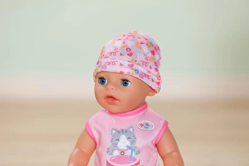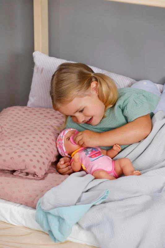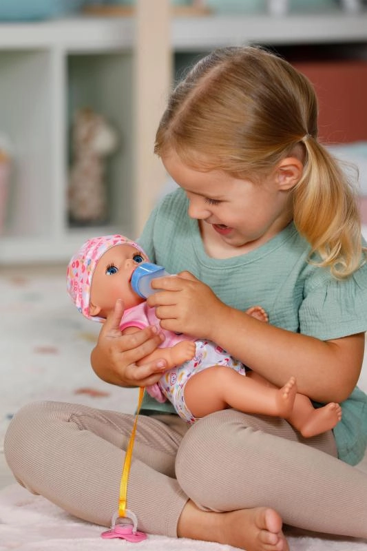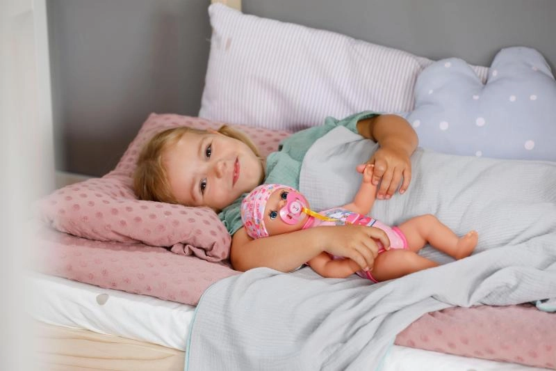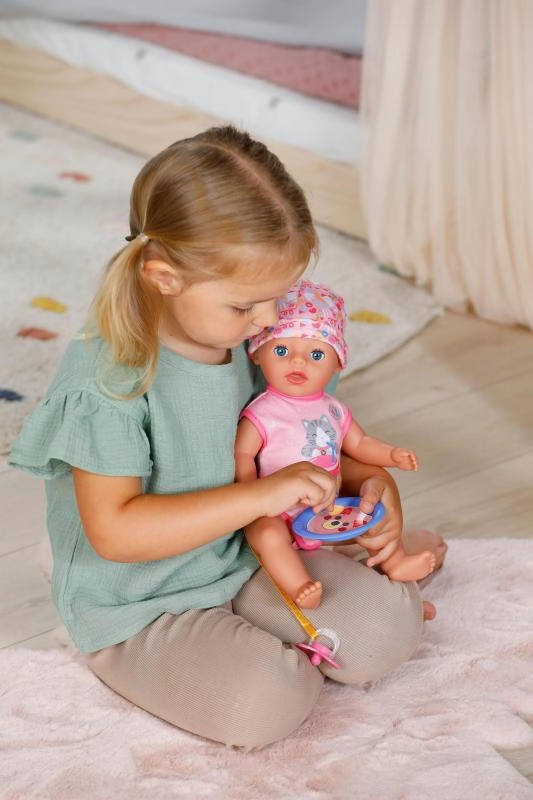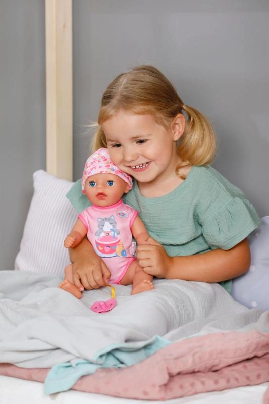 Der an den Stramplern befestigte Schnuller mit niedlichem Katzenmotiv ermöglicht es der Puppe, auch im Sitzen die Augen zu öffnen und zu schließen. Beim Hinlegen schließt sie die Augen von selbst, als würde sie wirklich einschlafen. Bewegliche Arme und Beine sowie ein drehbarer Kopf erleichtern das An- und Ausziehen, sodass kleine Pflegeprofis alles selbst schaffen.