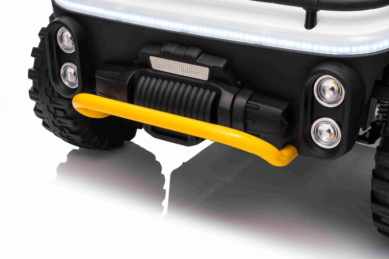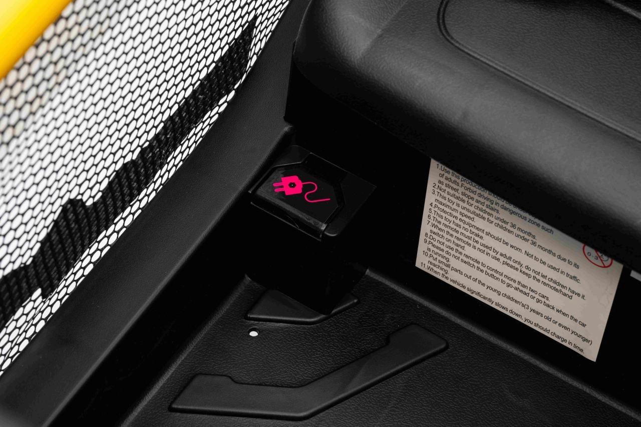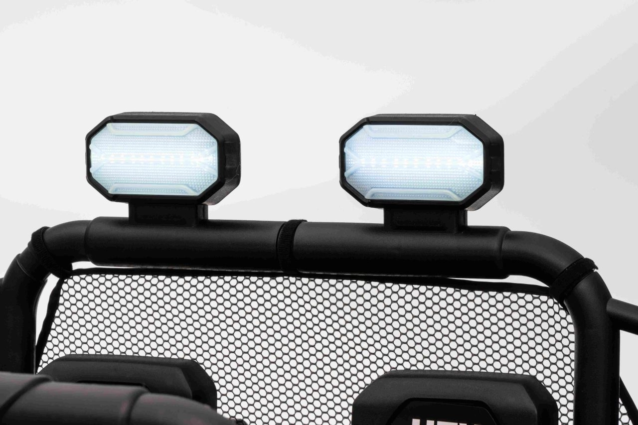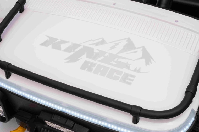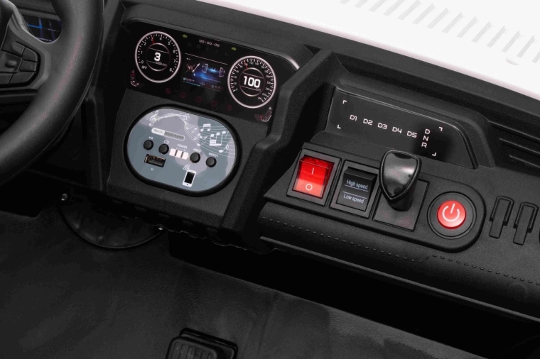 Für Sicherheit sorgen Sicherheitsgurte, hohe Rückenlehnen und die 2,4-GHz-Elternfernbedienung mit drei Geschwindigkeiten und Stopp-Button. Für tolle Stimmung sorgen LED-Lichter vorne und auf dem oberen Rahmen sowie ein Multimedia-Panel mit MP3/USB/Bluetooth, Sounds und Hupe.