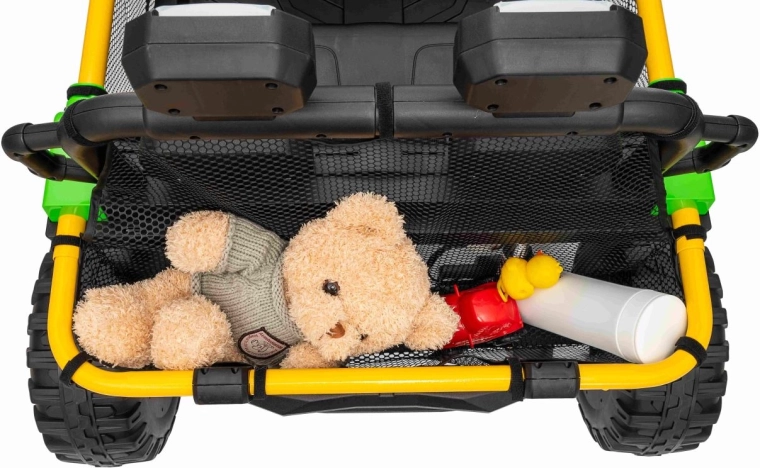 Der Innenraum bietet einen Zweisitzer mit Gurten, ein übersichtliches Cockpit und ein Audiopanel mit Bluetooth, USB und MP3. Sanftes Anfahren, Wahl vorwärts/rückwärts und zwei Fahrgeschwindigkeiten machen die Fahrt sicher und bequem. Der hintere Staubkorb fasst Spielzeug und Snacks für unterwegs.