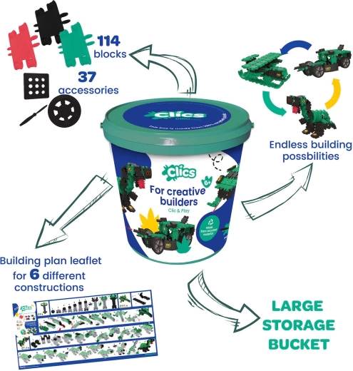 Durch bewegliche Verbindungen und das clevere Klicksystem trainieren Kinder Geschicklichkeit, Logik und Geduld. Der verschließbare Eimer mit Deckel hält die Bausteine zu Hause wie unterwegs zusammen und ist auf Langlebigkeit ausgelegt. Das Set ist ideal für kleine Entdecker, die von der Welt der Dinosaurier fasziniert sind.