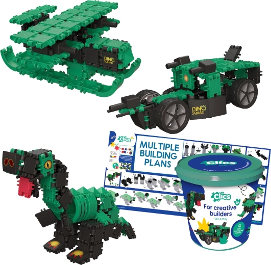 Der Clics Dinosaurier-Eimer bietet reichlich Bastelspaß: Aus 141 stabilen Kunststoffteilen in Naturfarben bauen Sie Schritt für Schritt 6 verschiedene Dinosaurier-Modelle nach den beiliegenden Karten. Sind alle gemeistert, können Sie eigene prähistorische Kreationen erschaffen und die Fantasie grenzenlos entfalten.