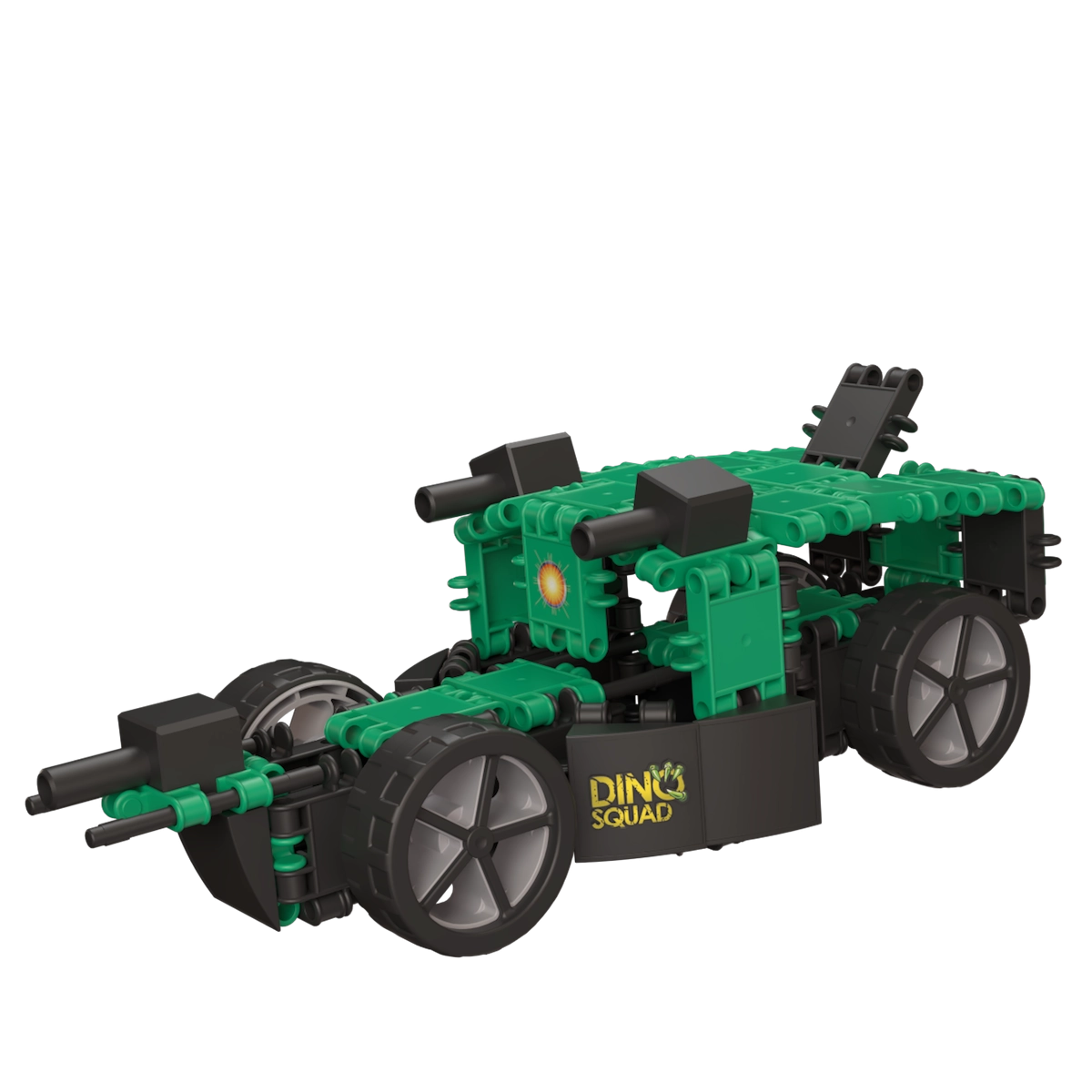Bauen Sie T‑Rex, Triceratops, Pterodaktylus und weitere nach Anleitung oder erfinden Sie eigene prähistorische Kreaturen und Fahrzeuge.