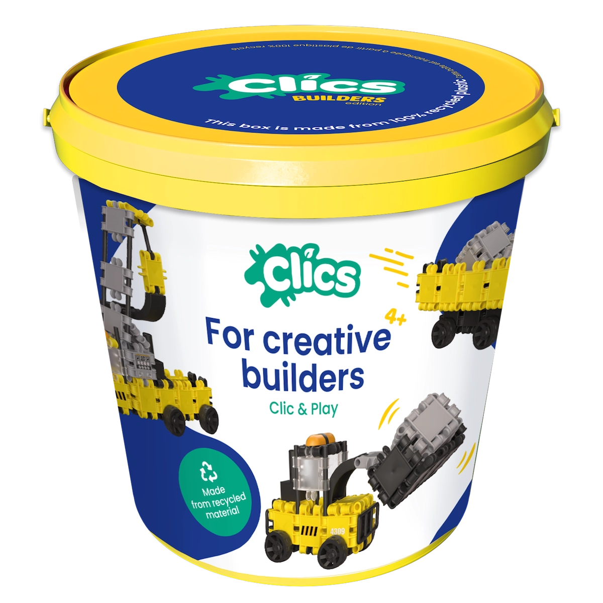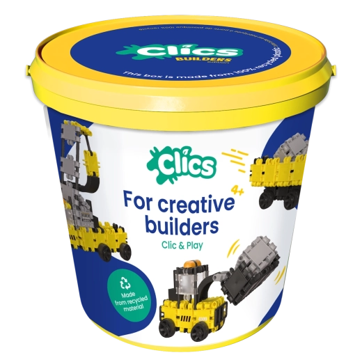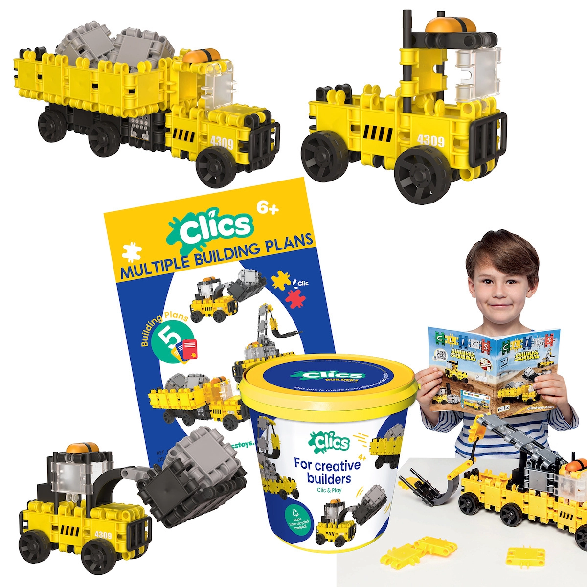 Gestalten Sie Ihre eigene Baustelle zu Hause mit dem Clics Baukasten Baumaschinen 5-in-1. Die Teile in kräftigen Baustellenfarben (Gelb, Orange, Schwarz) klicken leicht zusammen, halten fest und ermöglichen gleichzeitig wiederholte Umbauten. Der praktische Eimer dient als Aufbewahrungsbox und tragbarer Koffer.