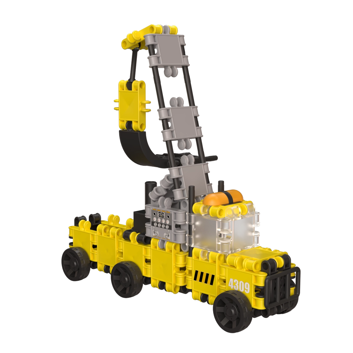 Funktionale Elemente wie Hubmechanik, Schaufel und drehbare Ausleger sorgen für realistischen Bauspaß und fördern die Feinmotorik.