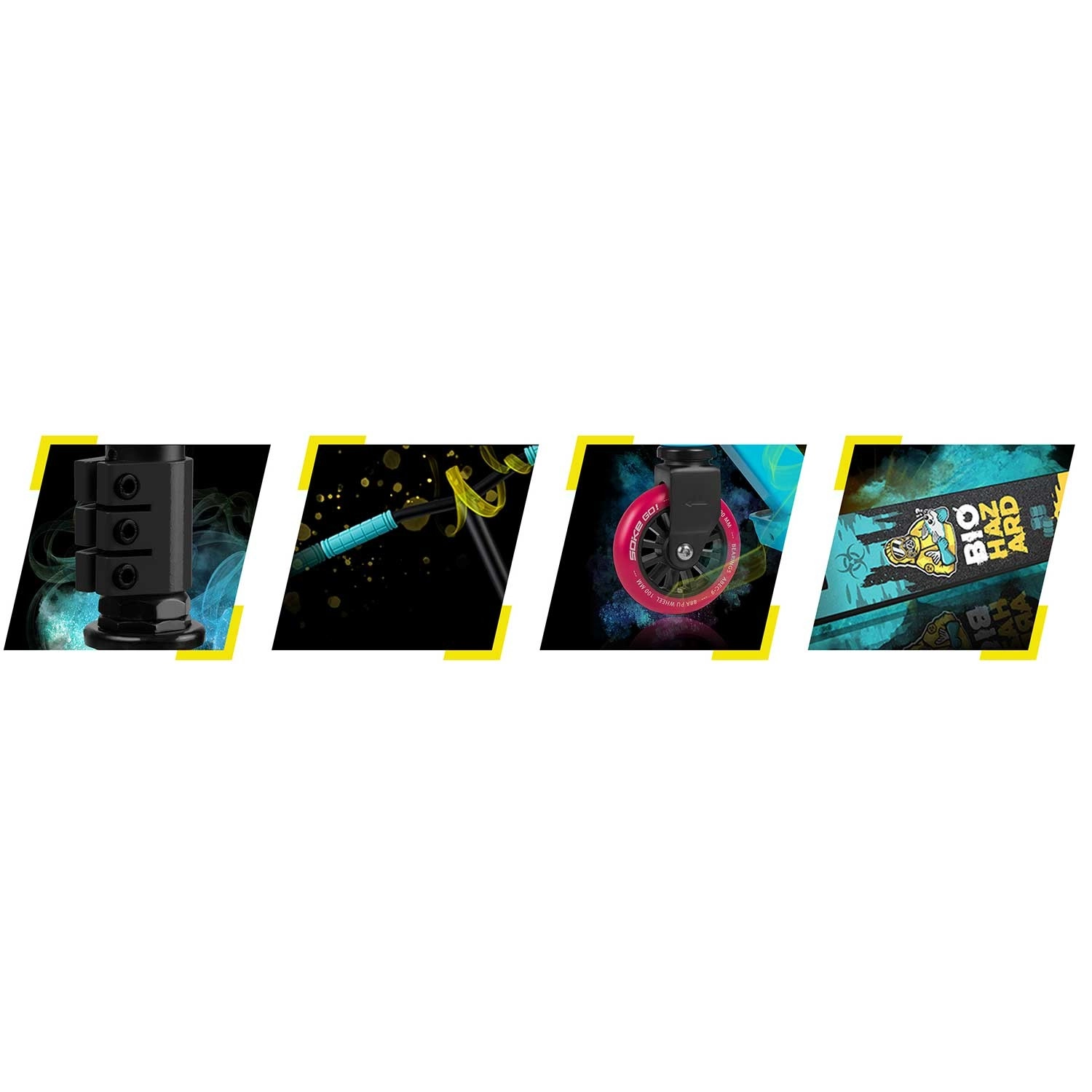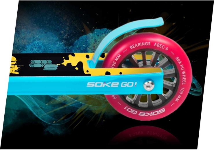 Für kontrolliertes Bremsen gibt es den Flex Fender aus Stahl, und die komplette Ausstattung erfüllt die Norm EN 14619. Der Roller ist für den Skatepark gedacht, scheut aber auch urbane Hindernisse nicht. Im Paket enthalten sind zudem Markenaufkleber und ein schwarzes SOKE-Armband, alles in einer stabilen, umweltfreundlichen Verpackung.