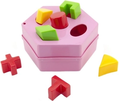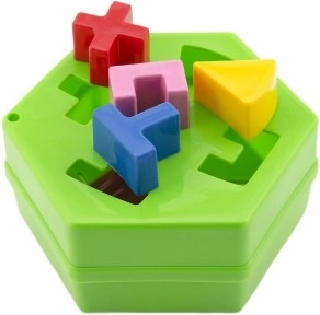 Dieses sechseckige Steckspielzeug aus Kunststoff ist ideal für Kleinkinder ab 12 Monaten. Es bietet neun verschiedene Öffnungen, in die Formen einsortiert werden können und hilft dabei, die Feinmotorik und das logische Denken spielerisch zu verbessern.