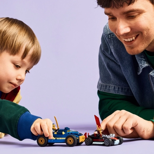 Entdecken Sie das actionreiche LEGO NINJAGO Bauset für Kinder ab 4 Jahren – Rennen Rogue vs. Drix mit zwei Autos, drei Minifiguren und einem einfachen Starterelement für schnelles Bauen. Freuen Sie sich auf Shooter, goldene Katanas und jede Menge packende Duelle zwischen Gut und Böse.