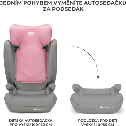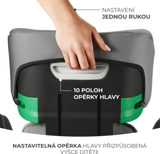 Die Kopfstütze lässt sich einhändig in 10 Stufen verstellen. Für größere Kinder (140–150 cm) kann die Rückenlehne abgenommen und ein bequemer, zugelassener Sitzerhöher verwendet werden.