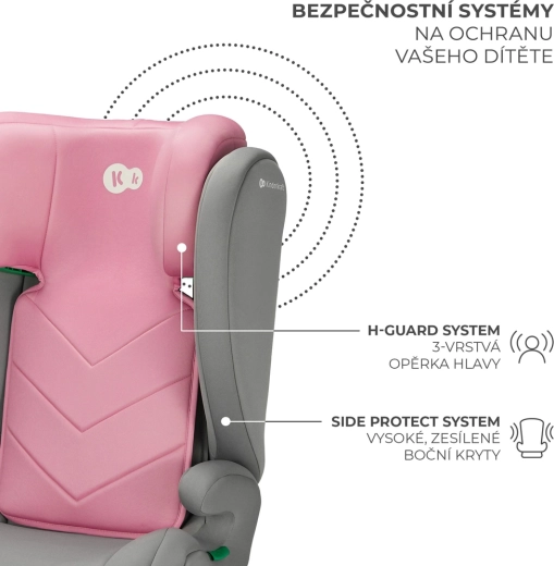 Den Schutz gewährleistet die Kombination der Systeme H-GUARD (3-lagige Kopfstütze) und SPS (verstärkte Seiten), die helfen, Aufprallenergie zu absorbieren und Kopf, Nacken, Schultern sowie die Wirbelsäule des Kindes zu schützen. Die Kopfstütze lässt sich einhändig in 10 Stufen verstellen, sodass der Sitz mit dem Kind mitwächst. Für größere Kinder kann die Rückenlehne abgenommen und ein Sitzerhöher für 140–150 cm gemäß R129 verwendet werden.
