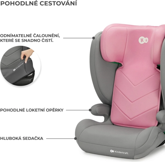 Für Komfort sorgen der tiefe Sitz mit weicher Polsterung, Armlehnen für ergonomisches Sitzen sowie ein abnehmbarer, waschbarer Bezug. Die Gurtführung über die Führungen an der Kopfstütze und unter der Armlehne erleichtert das richtige Anschnallen. Praktische Materialien: Schale aus HDPE, Bezug aus Polyester – robust und pflegeleicht.
