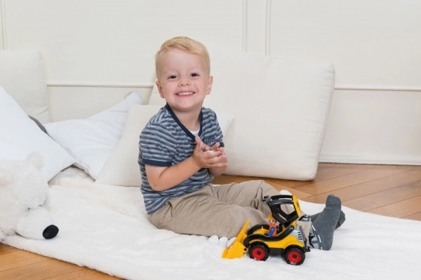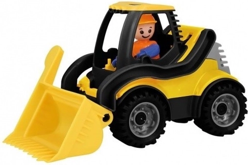 Die Frontschaufel lässt sich leicht anheben und abkippen, sodass Kinder Sand oder Bausteine wie mit einem echten Lader aufnehmen und umschütten können.